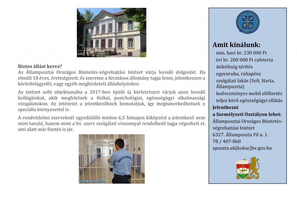 ÁLLÁSAJÁNLAT – AZ ÁLLAMPUSZTAI ORSZÁGOS BÜNTETÉS-VÉGREHAJTÁSI INTÉZET FELHÍVÁSA