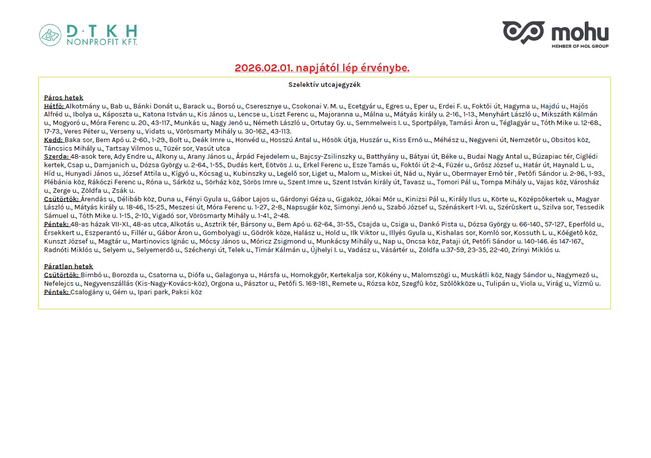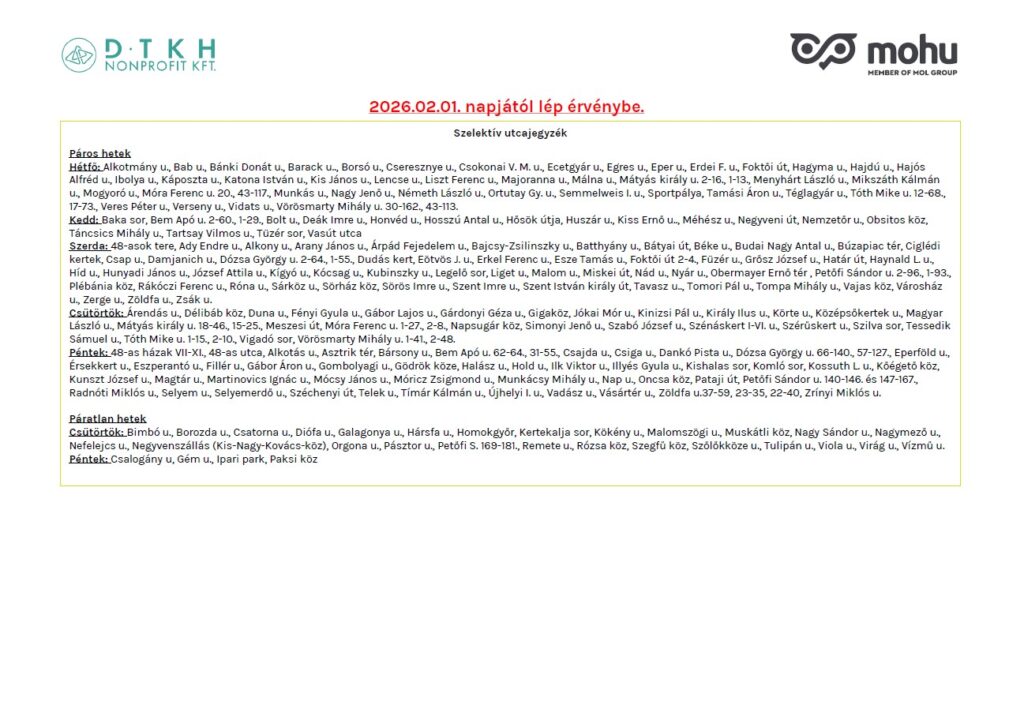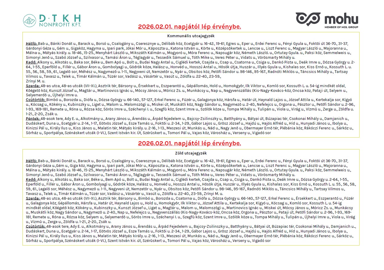 Kisebb változások lesznek 2026. február 1.-től a kommunális hulladék, szelektív hulladék és a zöldhulladék járatok utcajegyzékében, továbbá egyes ürítési napok áthelyeződtek, melyeket részletezve a 2.-3. oldalon találhatnak.