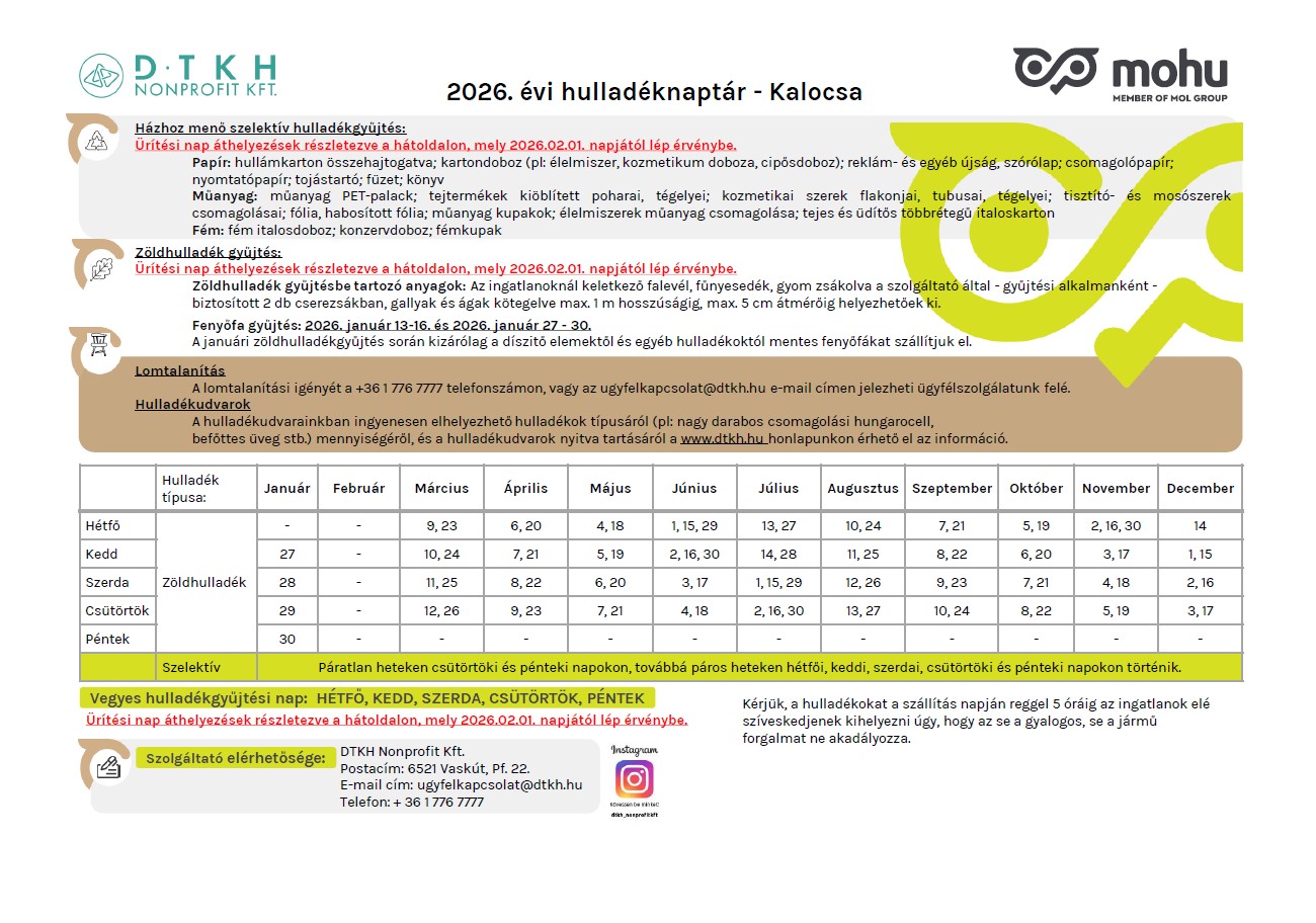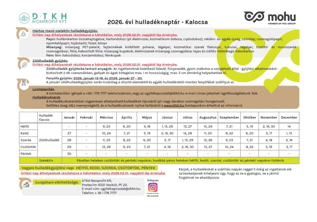 Ezúton tesszük közzé a DTKH NONPROFIT KFT. által hivatalosan meghirdetett idei, 2026. évi hulladékszállítások időpontjait.