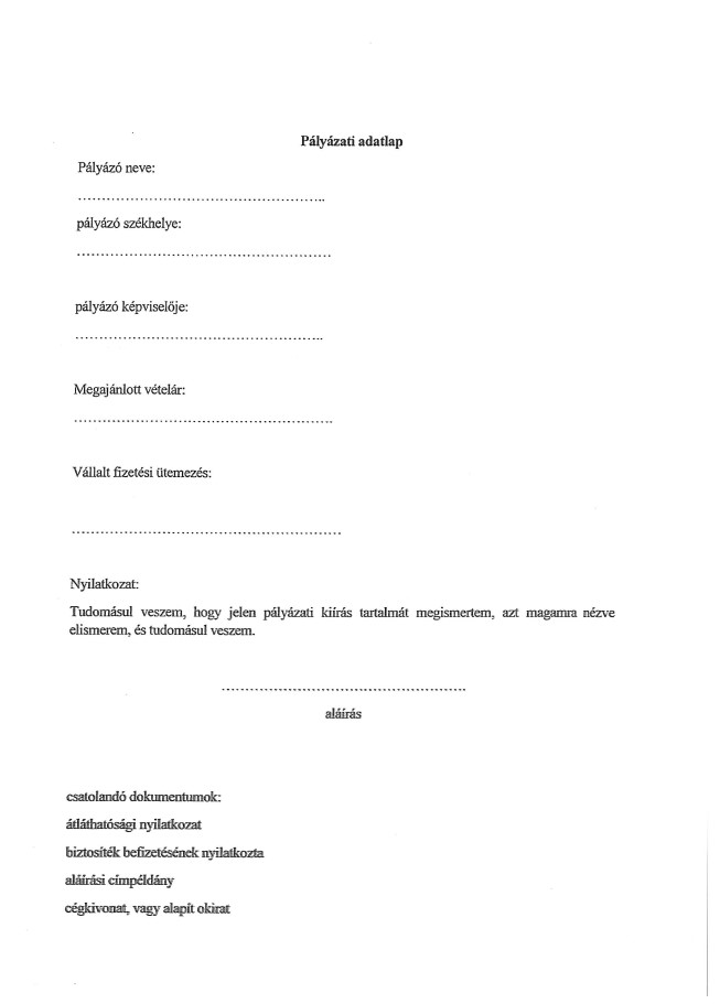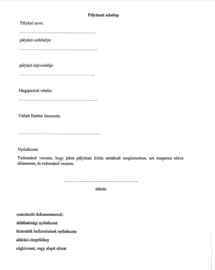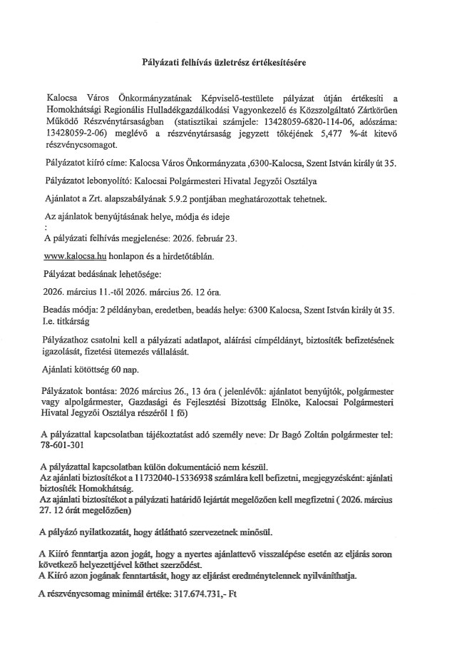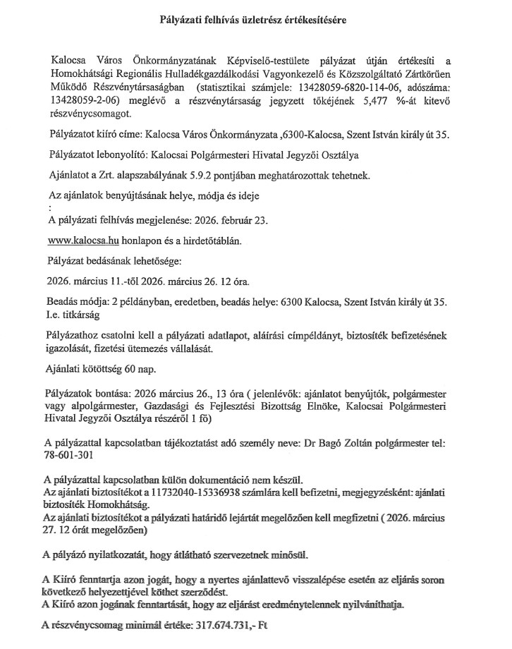 Kalocsa Város Önkormányzatának Képviselő-testülete pályázat útján értékesíti a Homokhátsági Regionális Hulladékgazdálkodási Vagyonkezelő és Közszolgáltató Zártkörűen Működő Részvénytársaságban (statisztikai számjele: 13428059-6820-114-06, adószáma: 13428059-2-06) meglévő a részvénytársaság jegyzett tőkéjének 5,477%-át kitévő részvénycsomagot.