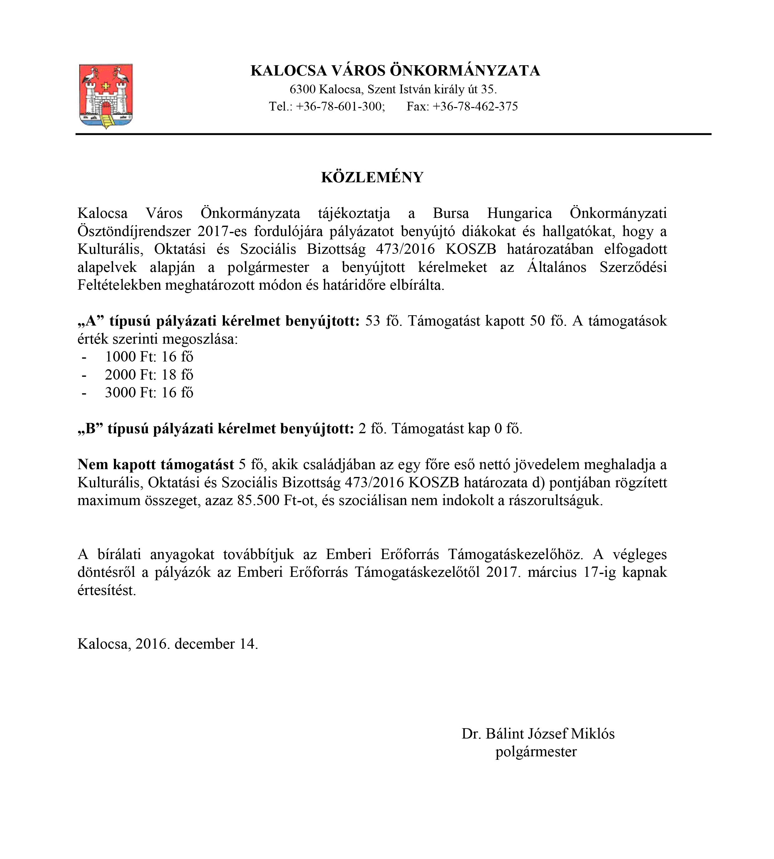2016. november 15-ig volt pályázható a Bursa Hungarica Önkormányzati Ösztöndíjrendszer 2017-es fordulója, melyre 55 fő nyújtott be pályázatot.