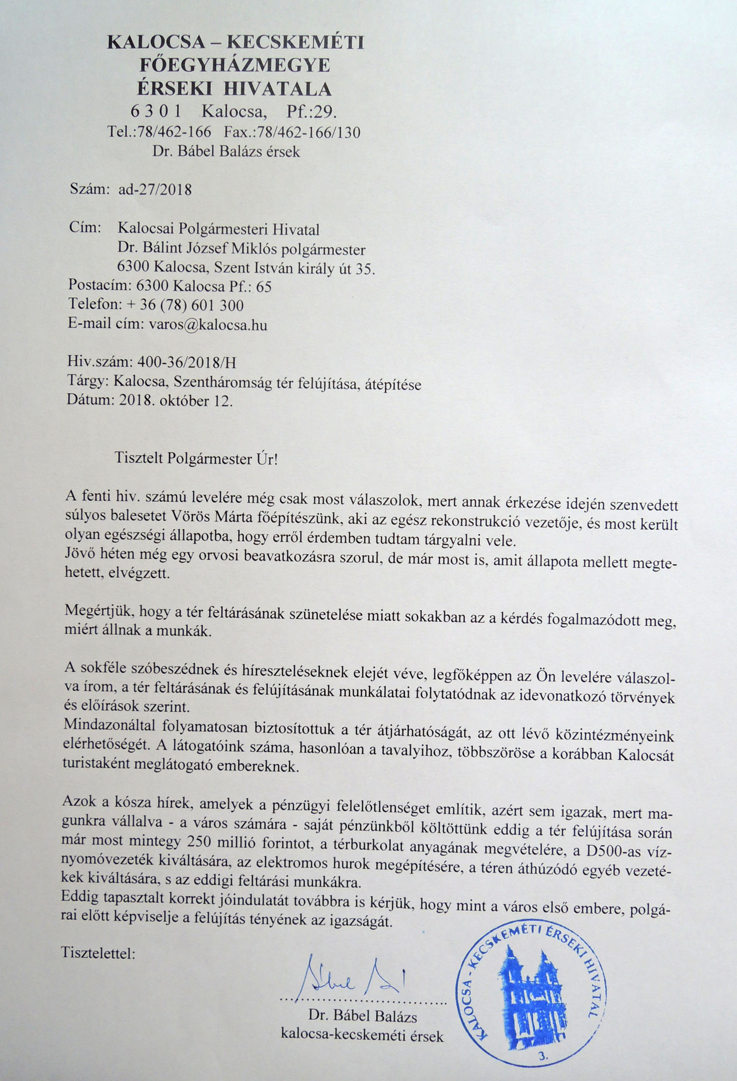 Érdeklődő levelemre Érsek Úrtól az alábbi válaszlevél érkezett, melynek közzétételéhez hozzájárult.