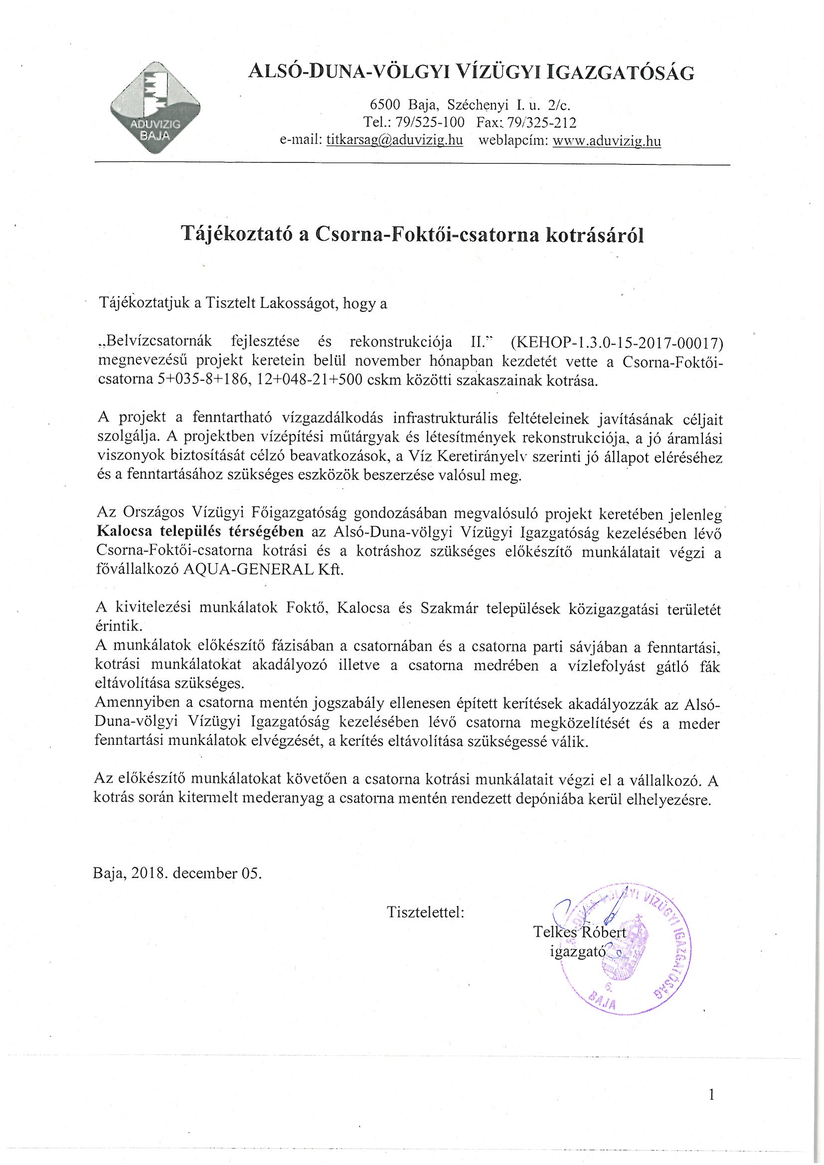 A Vízügy tájékoztatója a Csorna-Foktői csatorna kotrási munkáiról 2018. december 6. Az Alsó-Duna-völgyi Vízügyi Igazgatóság a korábbi írásunk nyomán a csatorna kotrási munkálatokról az alábbi tájékoztatót juttatta el Kalocsa Város Önkormányzatához: