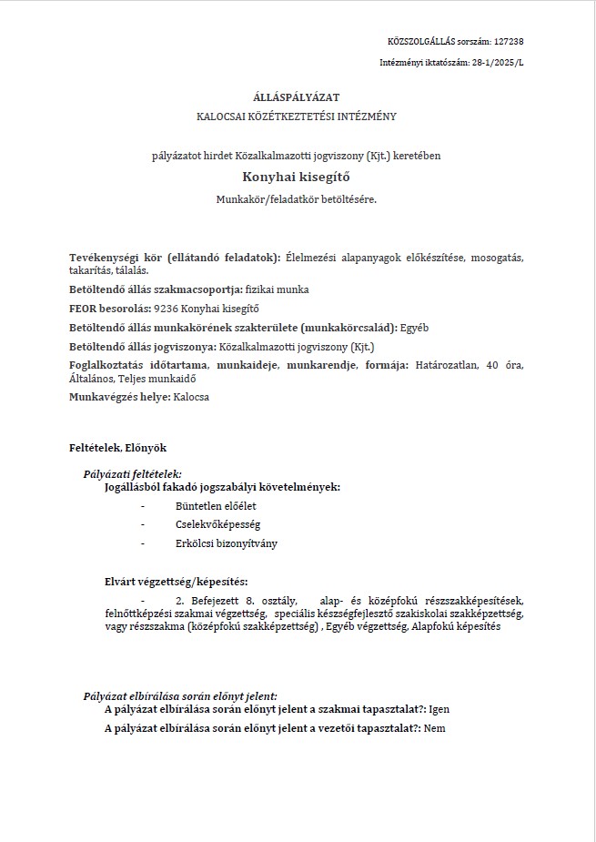 A Kalocsai Közétkeztetési Intézmény pályázatot hirdet közalkalmazotti jogviszony keretében konyhai kisegítő munkakör betöltésére.
