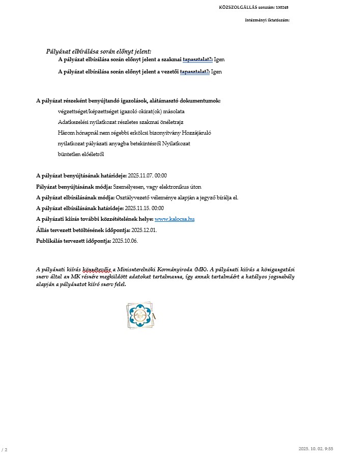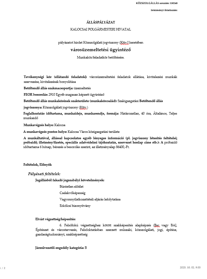 ÁLLÁS HIRDETÉS 2025. október 2. Kalocsa Város Polgármesteri Hivatala pályázatot hirdet városüzemeltetési ügyintéző munkakör betöltésére.