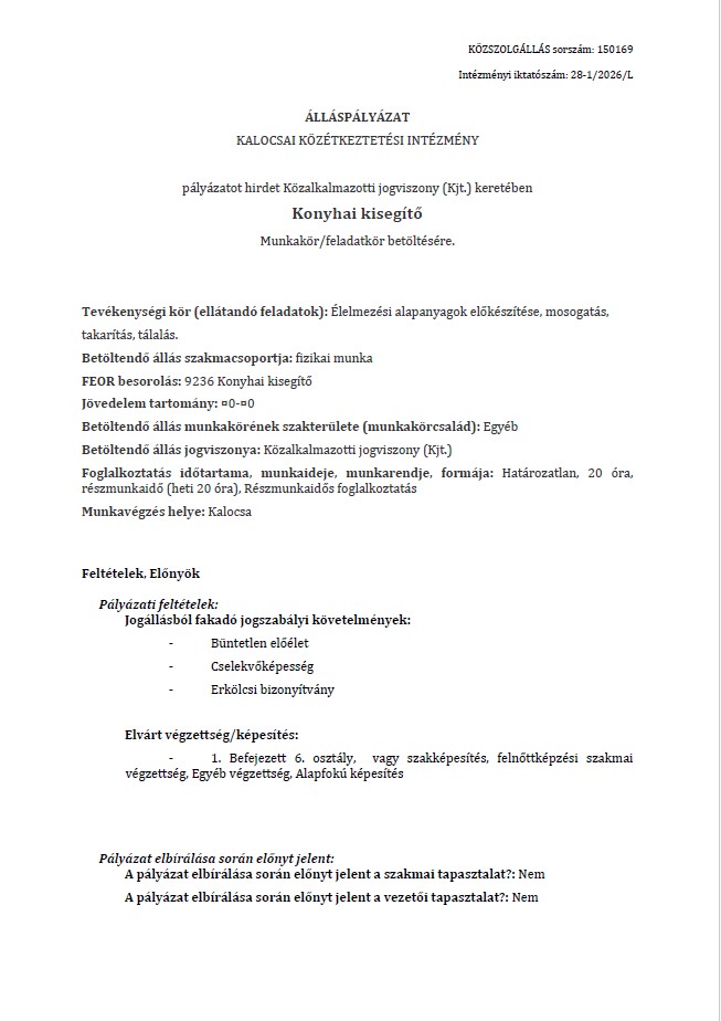 • valamint a munkakör megnevezését: konyhai kisegítő (teljes munkaidős – 8 órás vagy részmunkaidős 4 órás)