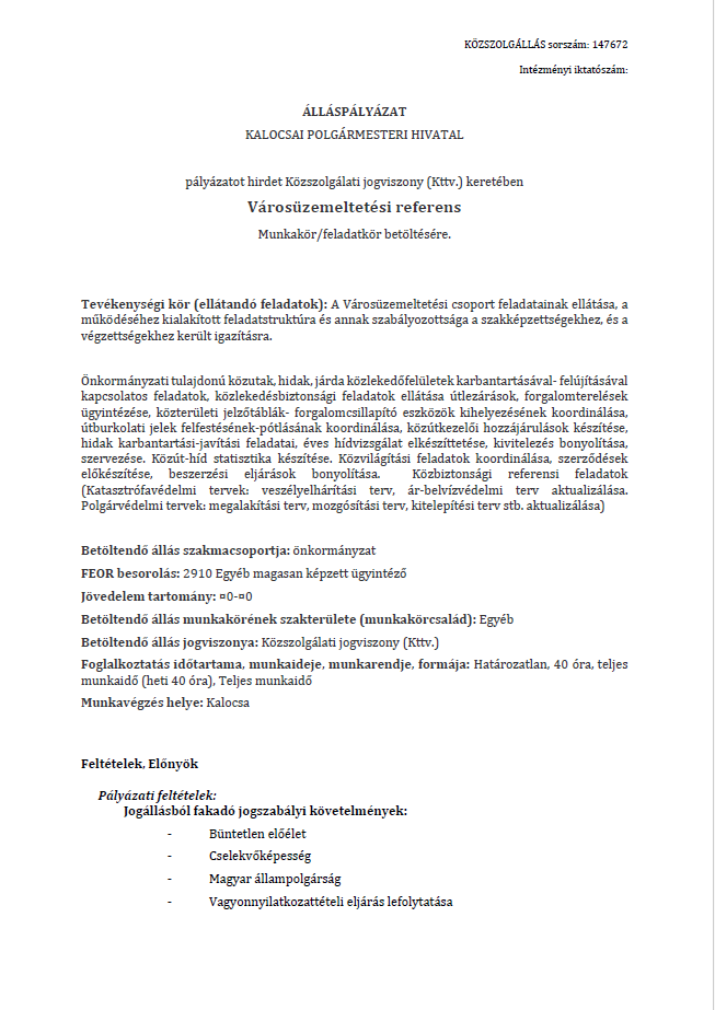 álláspályázat – városüzemeltetési referens 2026. március 26. A Kalocsai Polgármesteri Hivatal pályázatot hirdet közszolgálati jogviszonyban VÁROSÜZEMELTETÉSI REFERENS munkakör betöltésére.