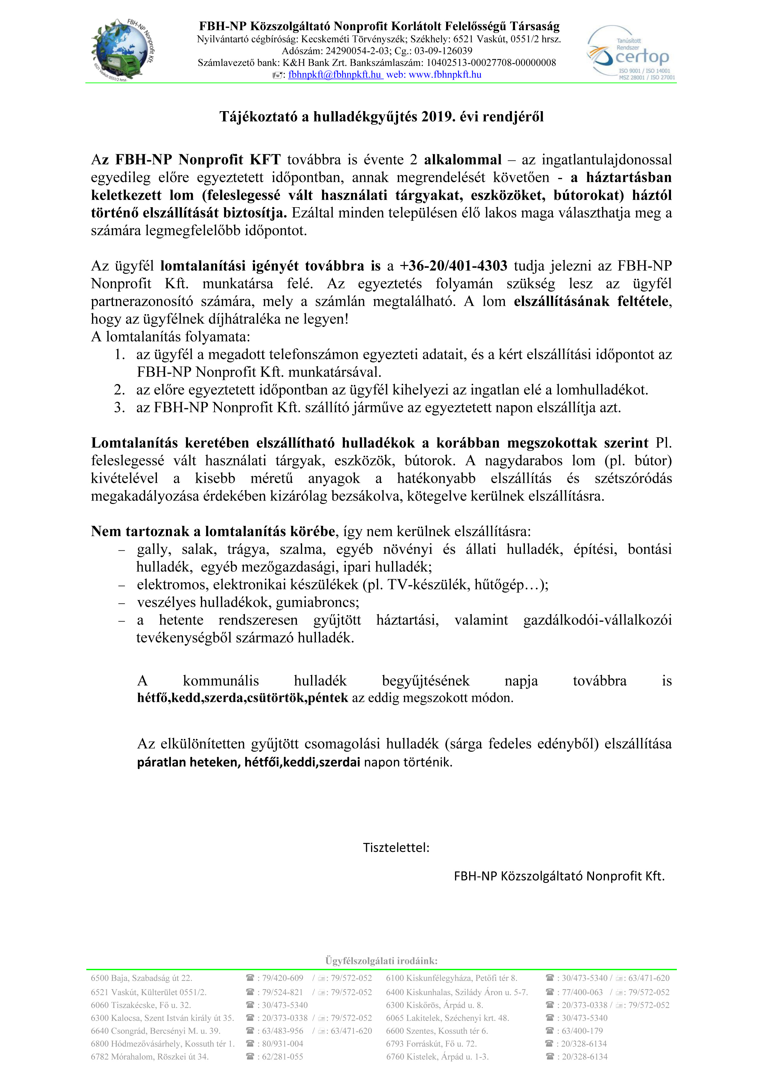 Az FBH-NP Nonprofit Kft. tájékoztatója a hulladékgyűjtés 2019. évi rendjéről 2019. március 11. Az FBH-NP Nonprofit Kft. az alábbiakban tájékoztatja a lakosságot a 2019. évi hulladékszállításról.