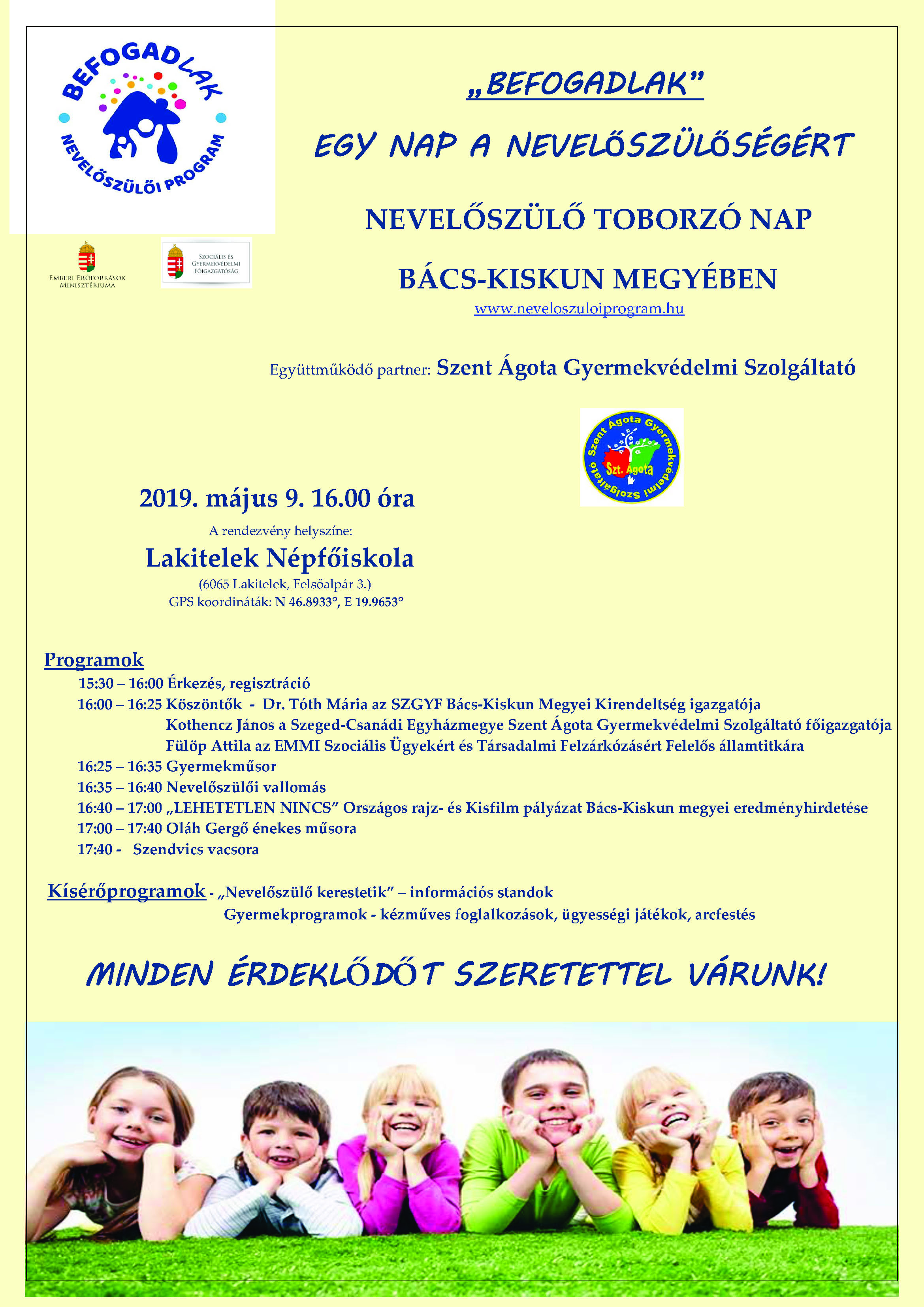 „Befogadlak” – nevelőszülő toborzó nap Esemény dátum: 2019. május 9. A Lakiteleki Népfőiskolán május 9-én 16 órától nevelőszülő toborzó nap lesz „befogadlak” – egy nap a nevelőszülőségért címmel, ahova minden érdeklődőt szeretettel várnak.