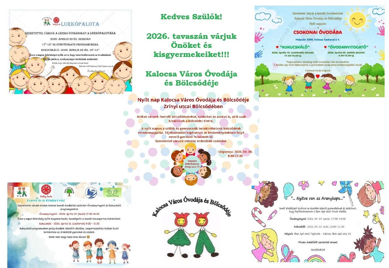 Ezúton hívjuk fel figyelmüket a Kedves Szülőknek, Nagyszülőknek hogy április hónapban megkezdődnek a Nyílt Napok a város óvodáiban és bölcsödéjében.
