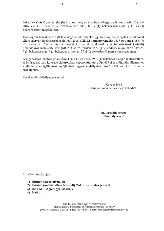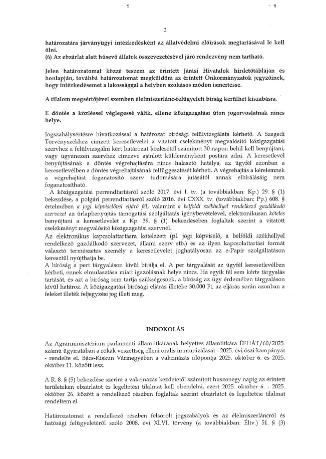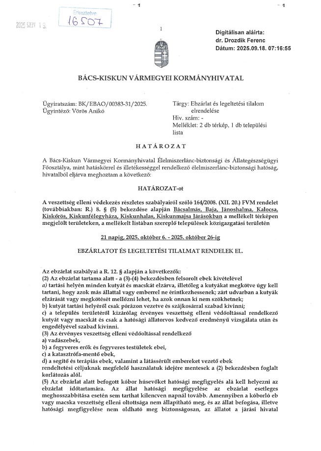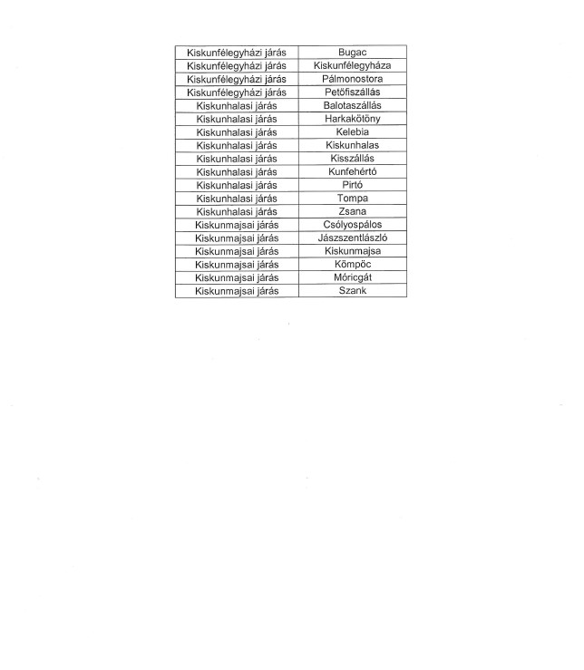 A Bács-Kiskun Vármegyei Kormányhivatal Élelmiszerlánc-biztonsági és Állategészségügyi főosztálya hivatalból eljárva 21 napig,