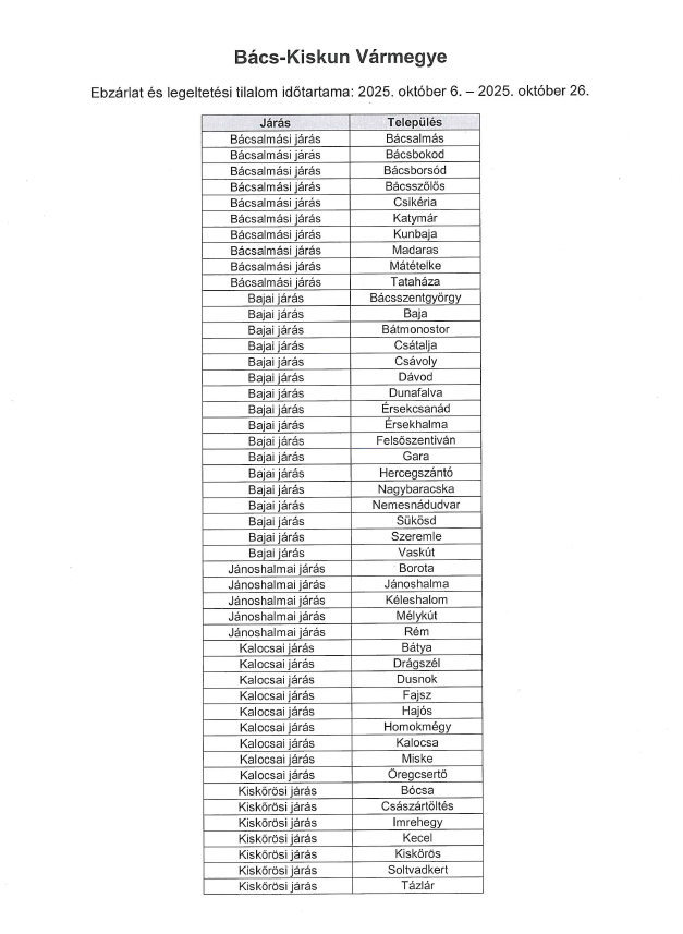 2025. október 6.- 2025. október 26-ig EBZÁRLATOT ÉS LEGELTETÉSI TILALMAT rendel el.