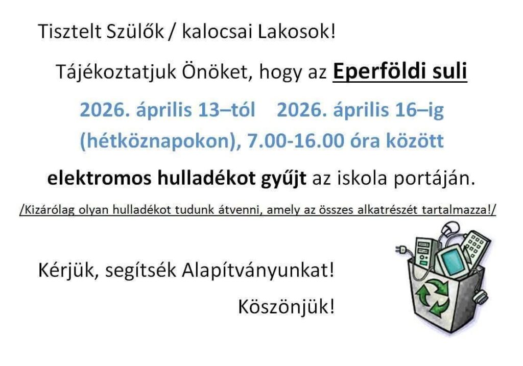 Ha elektromos hulladék bújik meg otthonukban, még várjanak kidobásukkal! Az Eperföldi Tagiskola ismét meghirdeti gyűjtési akcióját, melynek bevételéből közvetett módon az iskola Alapítványát támogathatják.