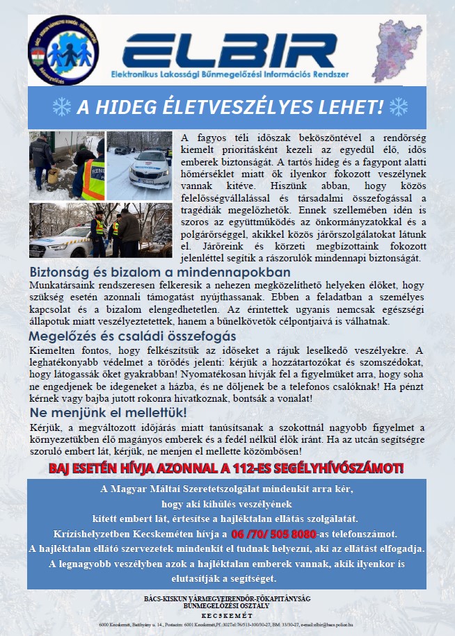 A BKVM Rendőrkapitányság Elektronikus Lakossági Bűnmegelőzési Információs Rendszer felhívásáaival már többször találkozhattak. A mostani plakátokon a „rendkívüli” téli időjárási körülmények rejtett és valós veszélyeire hívják fel a figyelmet.