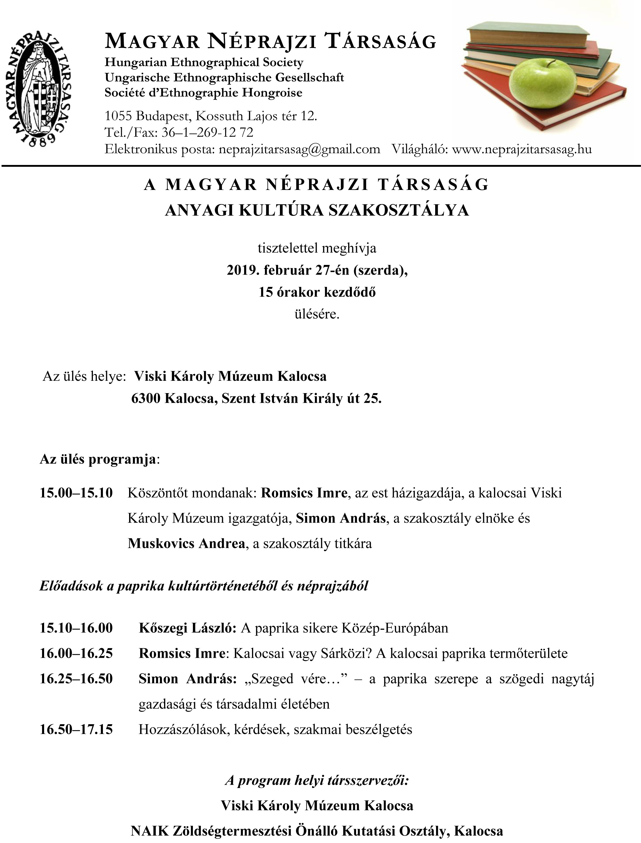 Előadások a paprika kultúrtörténetéből és néprajzából Esemény dátum: 2019. február 27. A Magyar Néprajzi Társaság február 27-én, szerdán 15 órától a Viski Károly Múzeumban ülést tart, ahol előadások hangzanak el a paprika kultúrtörténetéből és néprajzából.