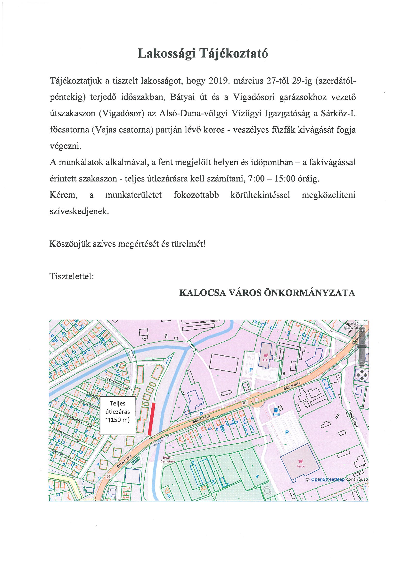 Fakivágás miatt teljes útlezárás 2019. március 21. Az ADUVIZIG március 27-től 29-ig a Vajas csatorna mentén veszélyes fűzfák kivágását fogja végezni. A munkálatok miatt teljes útlezárásra lehet számítani. Részletek a tájékoztatóban.