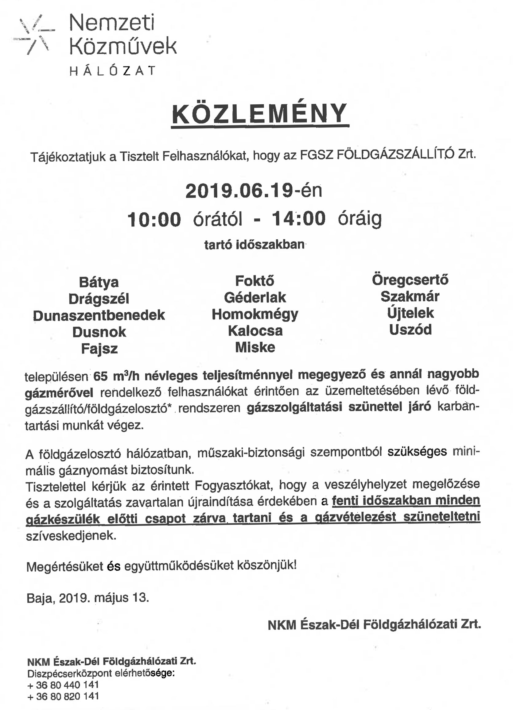 Gázszolgáltatási szünet karbantartás miatt 2019. május 17. Az NKM Észak-Dél Földgázhálózati Zrt. értesíti a fogyasztókat, hogy karbantartás miatt június 19-én 10 és 14 óra között a gázszolgáltatás szünetelni fog.