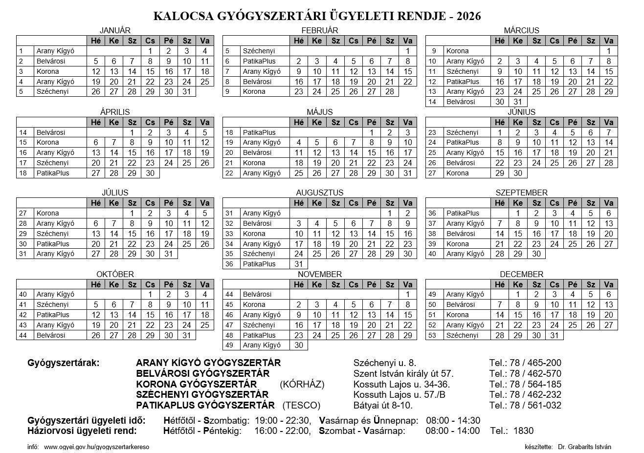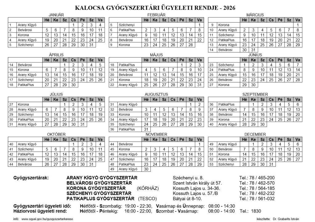 Az alábbi linken valamint plakáton érhetik el a város gyógyszertárainak jövő évi ügyeleti beosztását. Az ügyeleti beosztás elsődleges célja, hogy az Önök folyamatos és biztonságos gyógyszerellátása az év minden napján elérhető legyen.