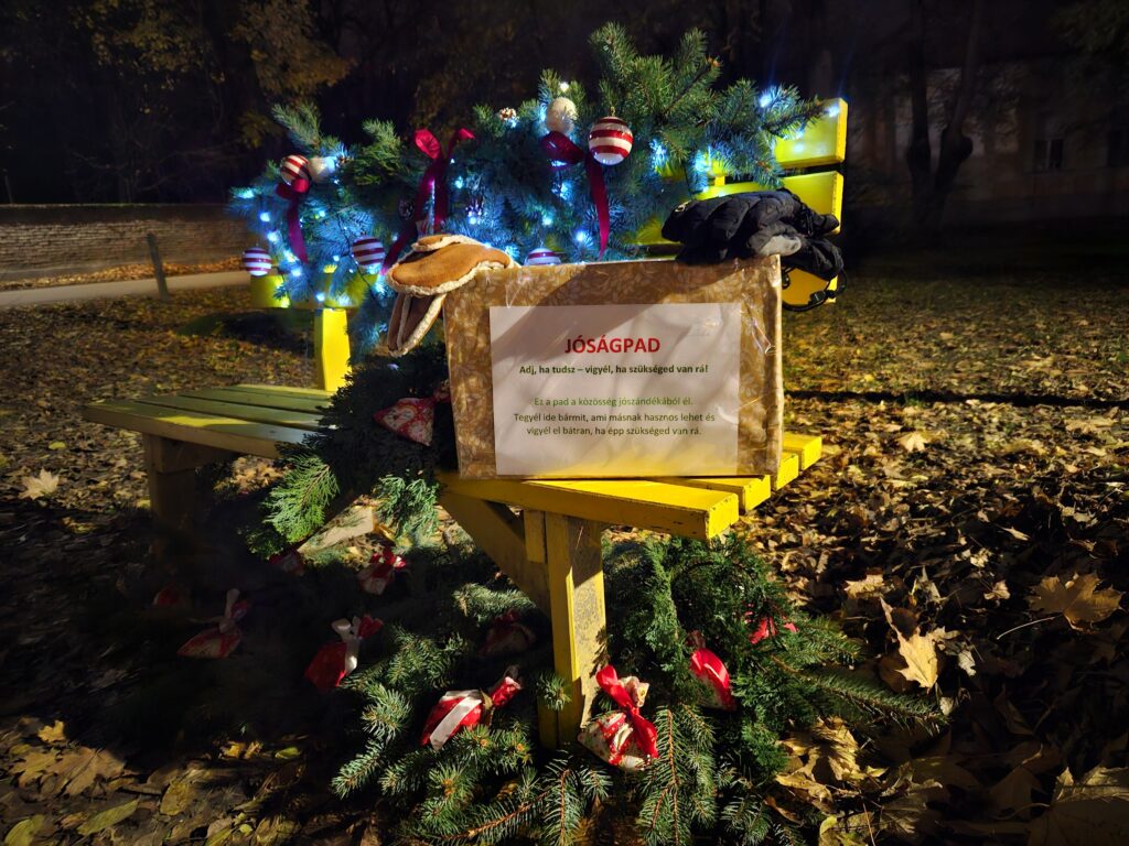 Aki a Kossuth Lajos utcán jár, nem csak egy feldíszített sárga padot, Jóságpad-ot fedezhet fel, hanem rajta egy kartondobozt is, amelybe beletenni is lehet különböző használati tárgyakat, sálat, sapkát, kesztyűt, plüssöket, és el is venni lehet belőle! MÉRTÉKKEL, DISZTINGVÁLVA!