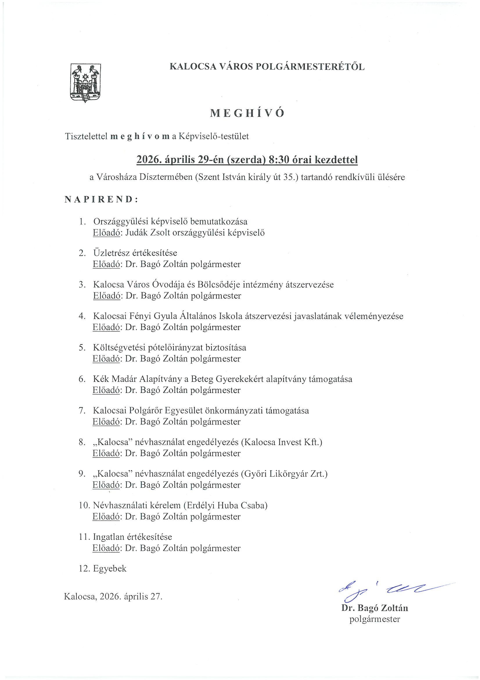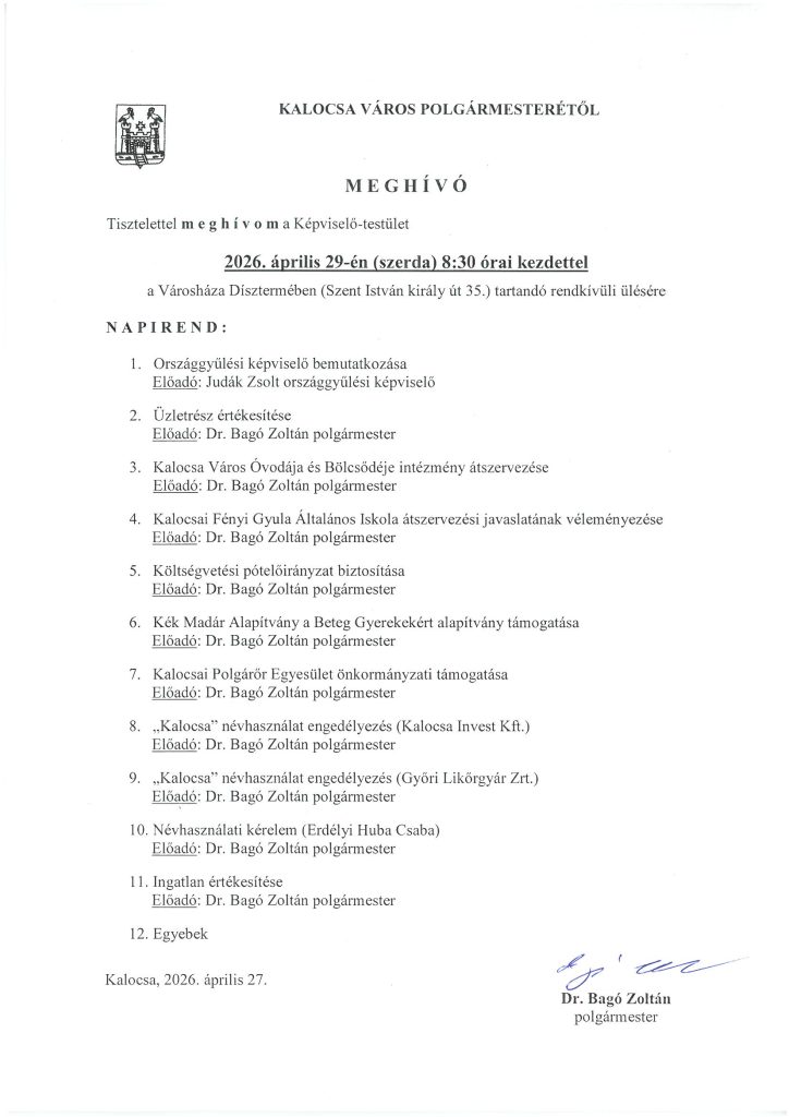 2026. április 29. szerdán 8:30-ra hívta össze dr. Bagó Zoltán polgármester a Képviselő-testületet a rendkívüli testületi ülésre. A meghívót és a napirendi pontokat alább találják.