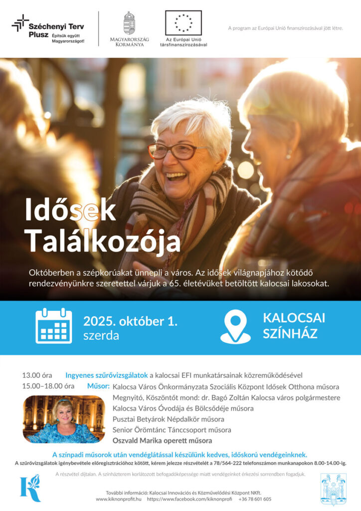 Kalocsa Város Önkormányzata és a KIKK Nonprofit Kft. október 1-jén, szerdán, az Idősek Világnapján vendéglátással egybekötött színes színpadi produkciókkal köszönti, ünnepli a város 65. életévüket betöltött lakosait. Az Idősek Találkozója elnevezésű eseménynek a Kalocsai Színház ad helyet. A három órán át tartó műsorfolyam sztárfellépője a magyar operett nagyasszonya, a Kossuth-és Jászai Mari-díjas Oszvald Marika énekművész lesz.