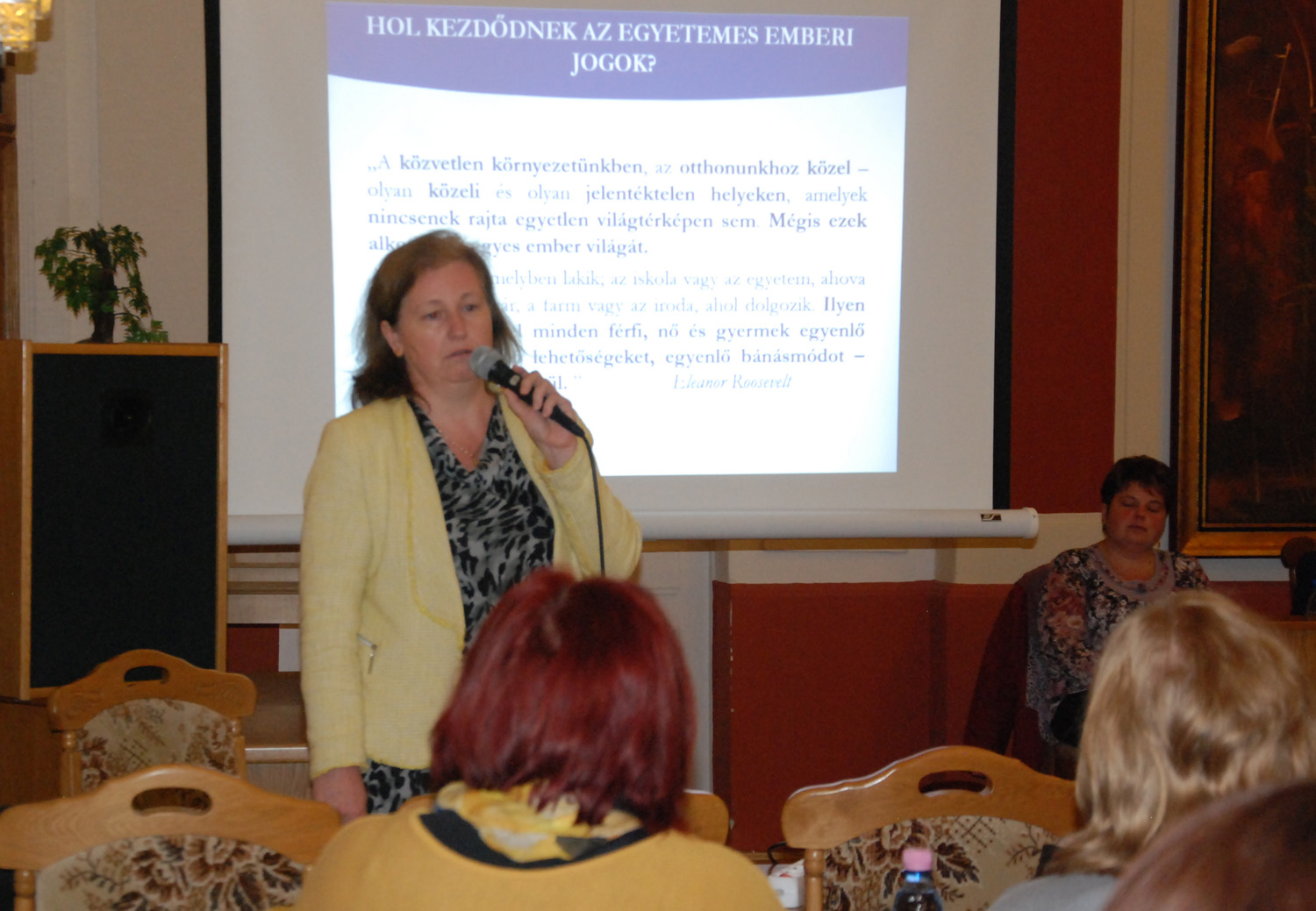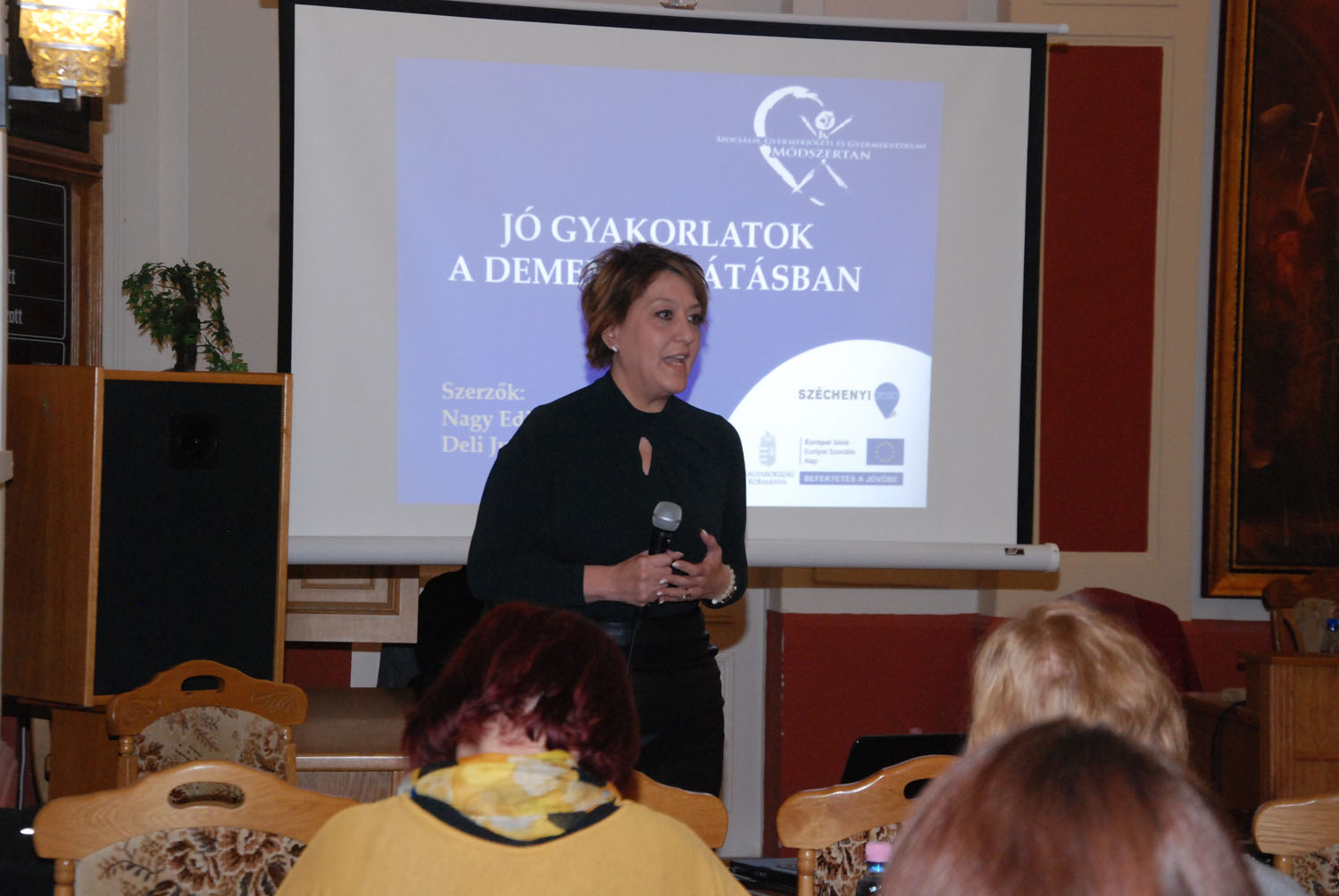 A szakmai nap témája a demens ellátás köré épült, emberi méltóság, ellátotti jogok, a közvetlen és közvetett hátrányos megkülönböztetés, az egyenlő bánásmód és még sok hasonló téma szóba került a konferencián Ráczné Németh Teodóra, a Szociális és Gyermekvédelmi Főigazgatóság mb. főosztályvezetője előadásában.