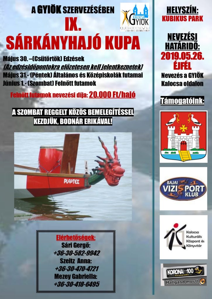 IX. Sárkányhajó Kupa Esemény dátum: 2019. május 30. - 2019. június 1. IX. Sárkányhajó Kupa a GYIÖK szervezésében május 30-31-június 1.