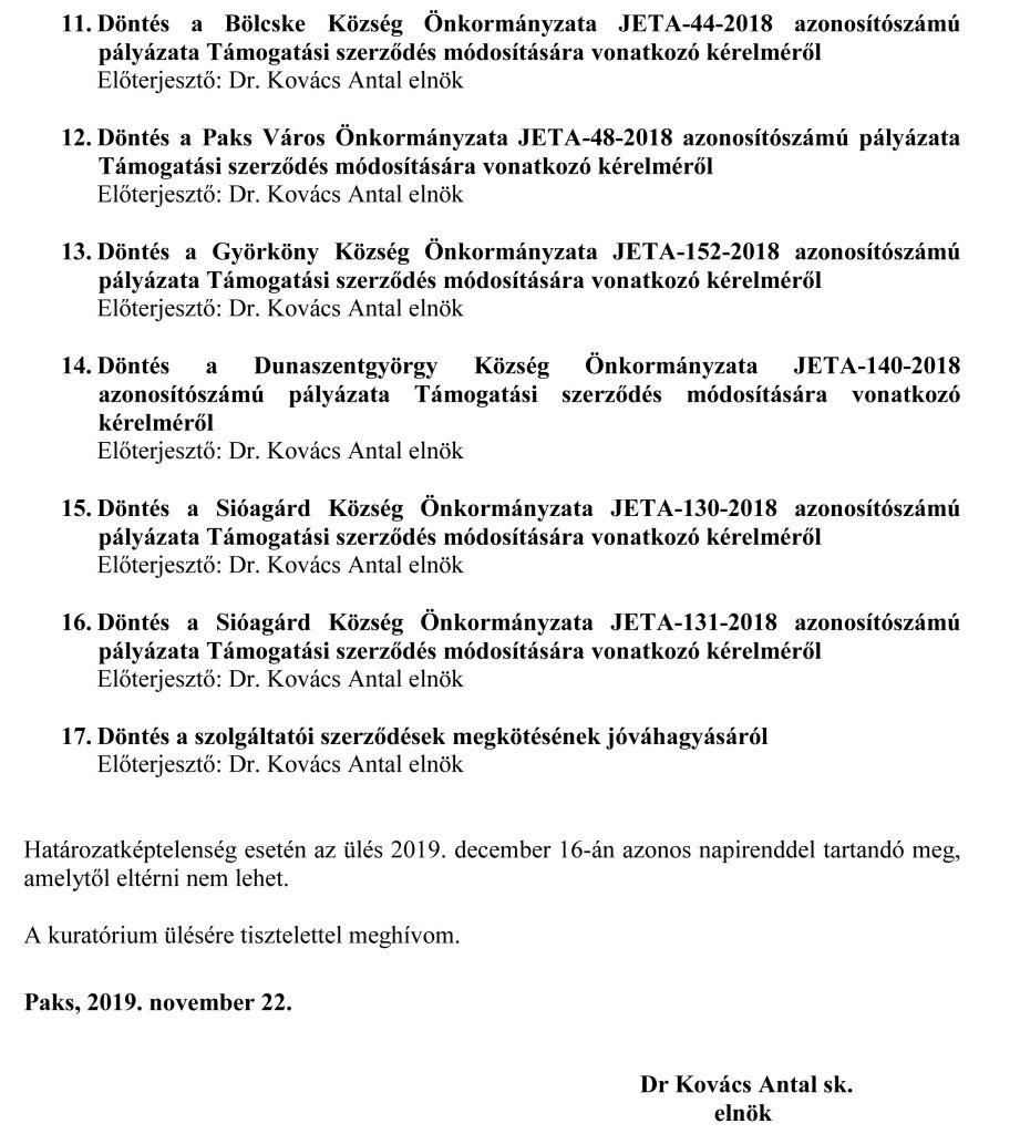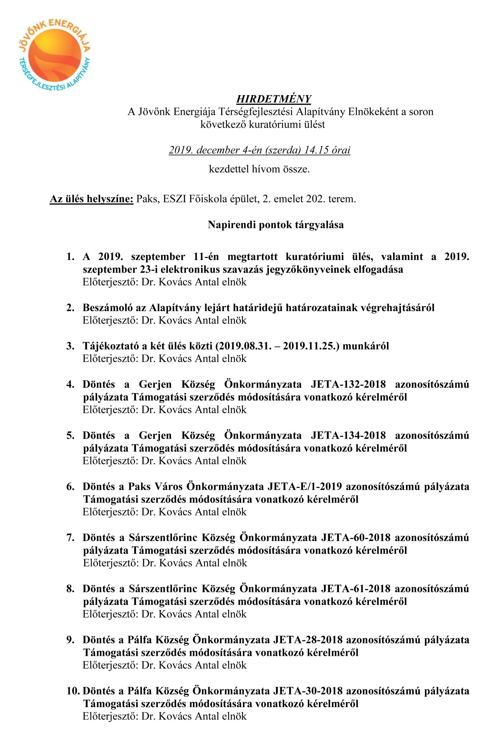 JETA kuratóriumi ülés 2019. november 29. A Jövőnk Energiája Térségfejlesztési Alapítvány kuratóriuma soron következő ülését 2019. december 3-án tartja Pakson az ESZI főiskola épületében. Részletek a meghívóban:
