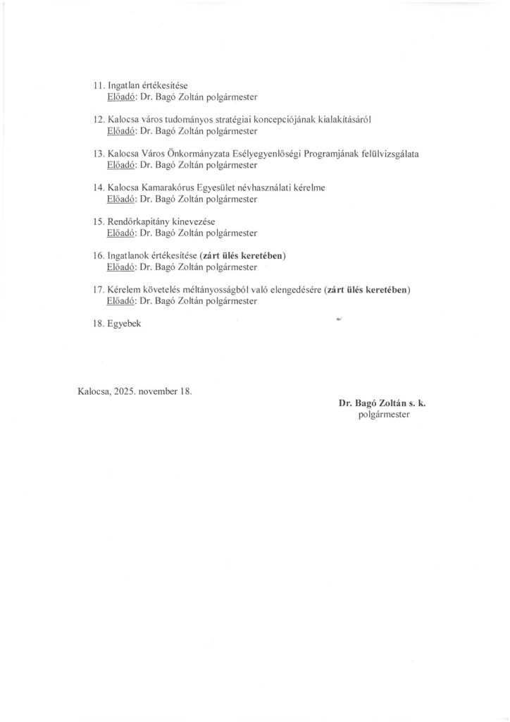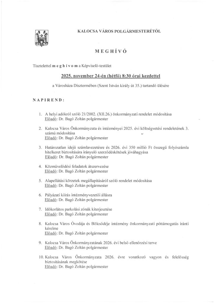 Dr. Bagó László polgármester ezúton hívja meg Önöket a Képviselő-testület következő ülésére, mely november 24. hétfőn 8.30 órakor kezdődik.
