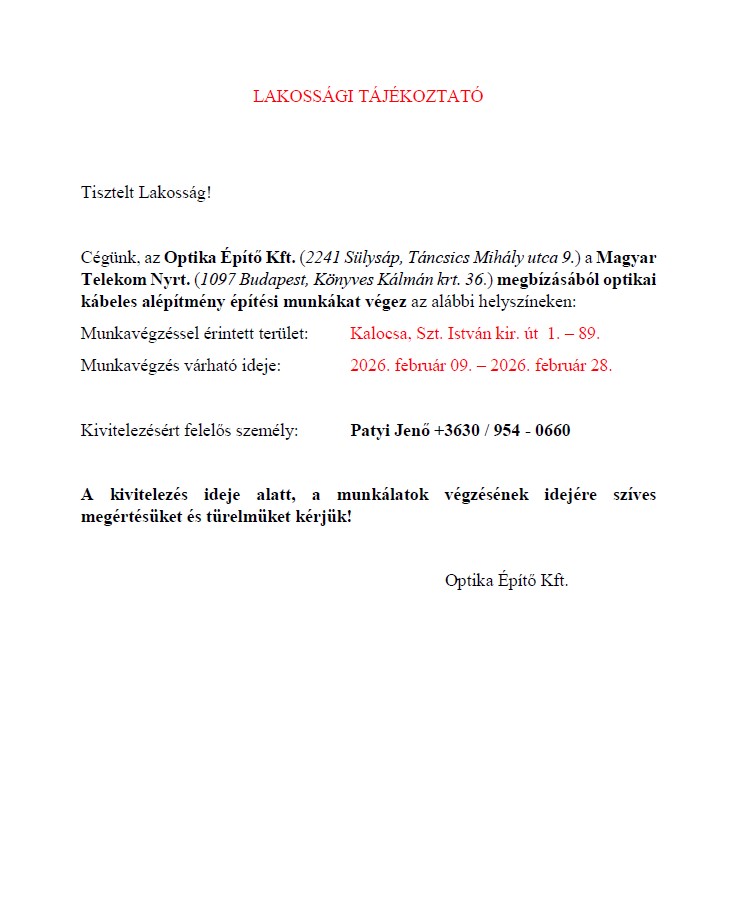 Az Optika Építő Kft. (2241 Sülysáp, Táncsics Mihály utca 9.) a Magyar Telekom Nyrt. (1097 Budapest, Könyves Kálmán krt. 36.) megbízásából optikai kábeles alépítmény építési munkákat végez városunkban. A cég következő felhívását tesszük közzé.