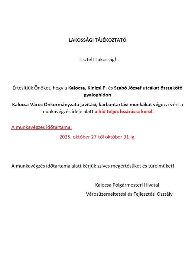 Értesítjük Önöket, hogy a Kinizsi utca és a Szabó József utcákat összekötő hídon karbantartási munkálatok lesznek, ezért a gyalogos és kerékpáros forgalom elől mindkét irányból le lesz zárva.