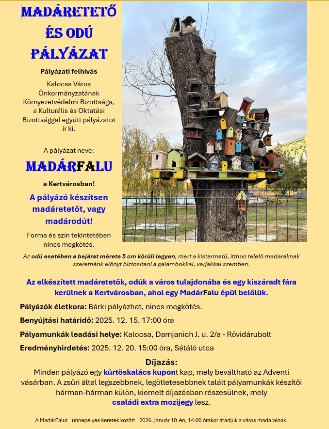 MADÁRFALU PÁLYÁZAT 2025. december 9. Kalocsa Város Önkormányzatának Környezetvédelmi Bizottsága, a Kulturális és Oktatási Bizottsággal együtt pályázatot ír ki. A pályázat neve: MadárFAlu a Kertvárosban! A pályázó készítsen madáretetőt, vagy madárodút!
