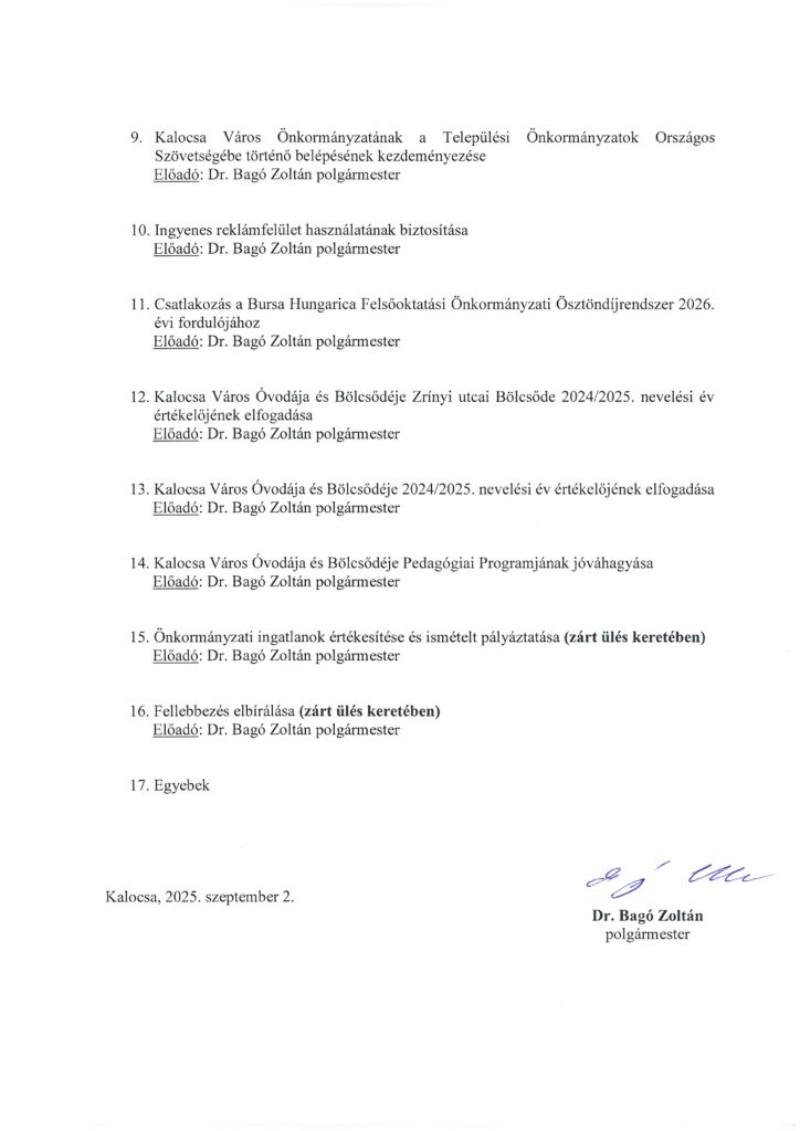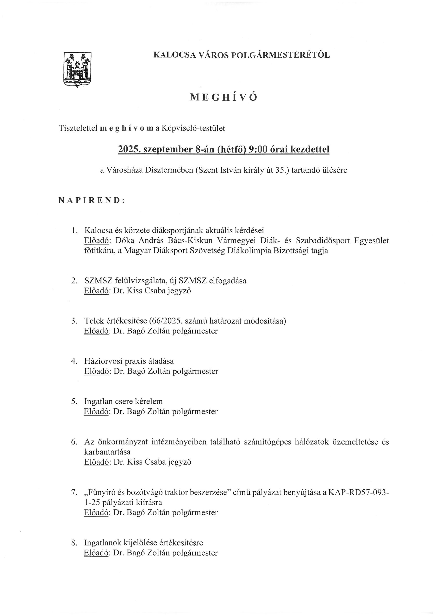 Ezúton hívjuk meg Önöket 2025. szeptember 8. hétfőn 9 órai kezdetű Képviselő-testületi ülésünkre, melynek helyszíne a Városháza Díszterme. A csatolt meghívón a napirendi pontokat olvashatják.