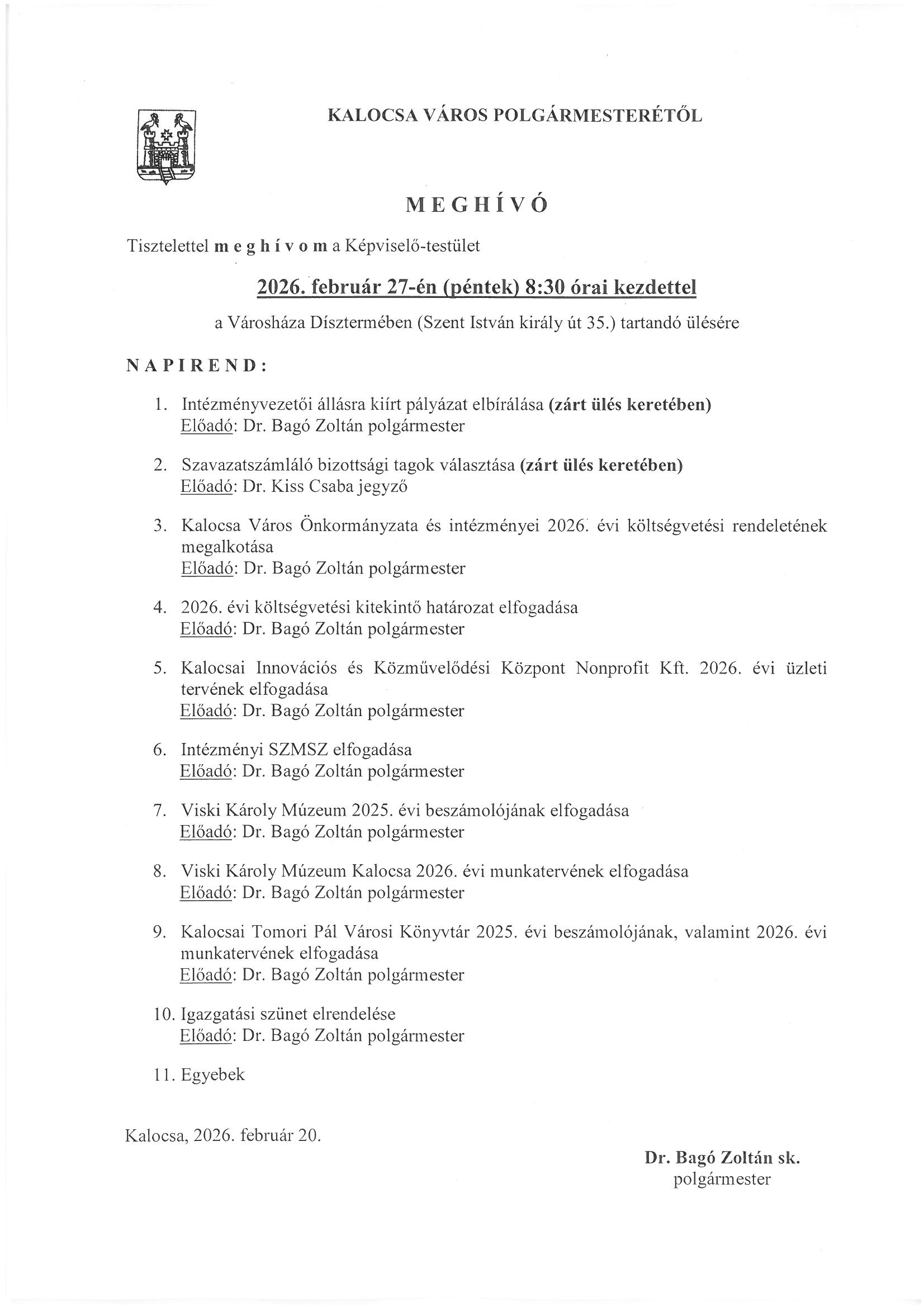 Dr. Bagó Zoltán polgármester tisztelettel hívja meg Önöket a soron következő Képviselő-testületi ülésre, mely február 27. (péntek) 8:30 órai kezdettel kerül megrendezésre.