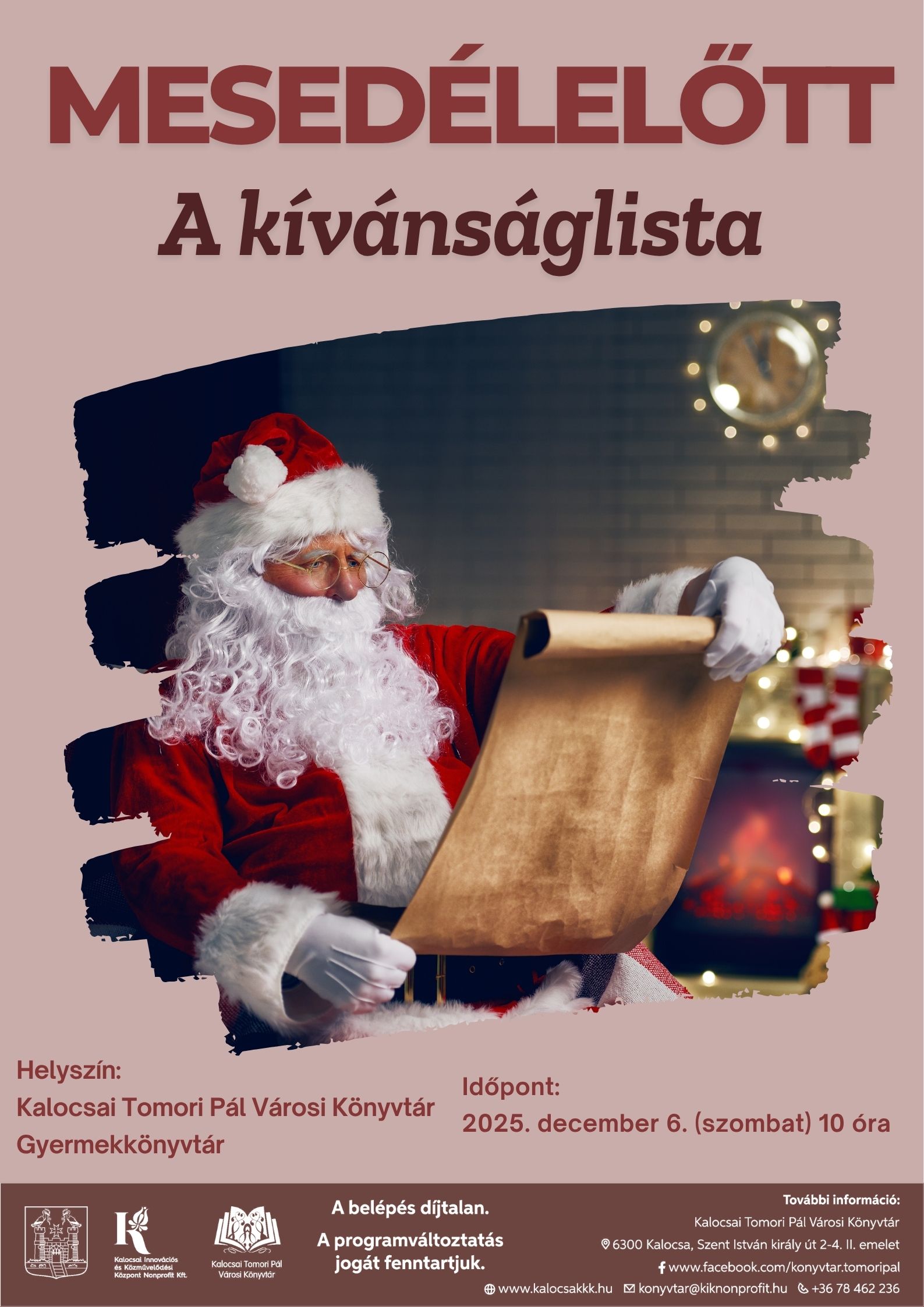 Mozgalmas, programokkal teli lesz az előttünk álló hétvége is! Szombati nap érkezik világszerte a Mikulás, a kicsik kitisztított csizmácskáikat, kiscipőiket kirakják az ablakokba. A különböző Mikulás ünnepségek és a vasárnapi Adventi gyertyagyújtás mellett egy szombat délelőtti programra is sok szeretettel várják a szervezők a gyerekeket a Gyermekkönyvtárba. Tíz órától a Mesedélelőttön vehetnek rész, ahol is a Kívánságlista lesz a téma.