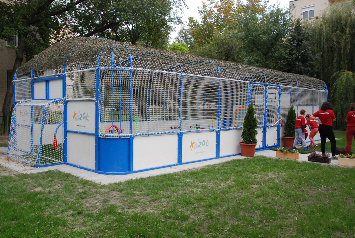 Acél váz szerkezettel van körbekerítve (oldalt és felül is), melyet oldalt rétegelt lemez palánk borít, a tetején pedig műanyag labdafogó hálóval van bevonva, mely UV-szűrős, ezért lehetőséget ad a nyári melegben is a használatra.