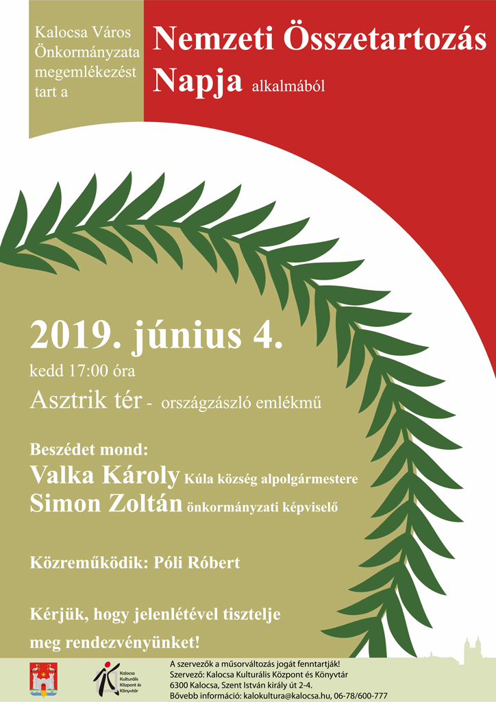 Nemzeti Összetartozás Napja Esemény dátum: 2019. június 4. Kalocsa Város Önkormányzata a Nemzeti összetartozás Napja alkalmából megemlékezést tart június 4-én az Országzászló emlékműnél.