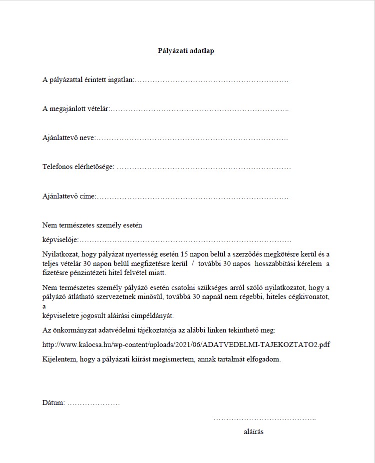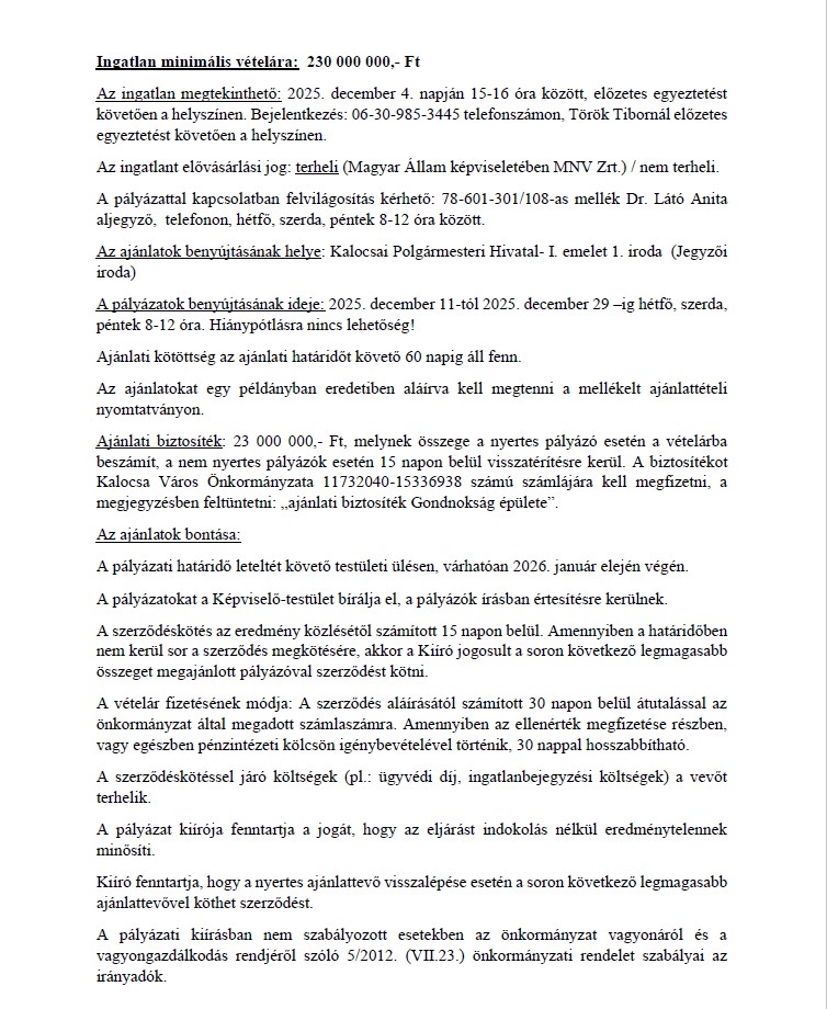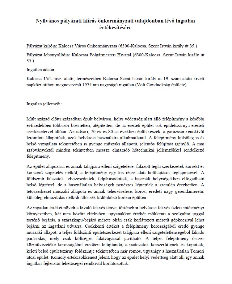 Kalocsa Város Önkormányzata ezúton hirdeti meg eladásra nyilvános pályázat útján a Kalocsa, Szent István király út 19. szám alatt lévő kivett napközi otthon megnevezésű ingatlanát.