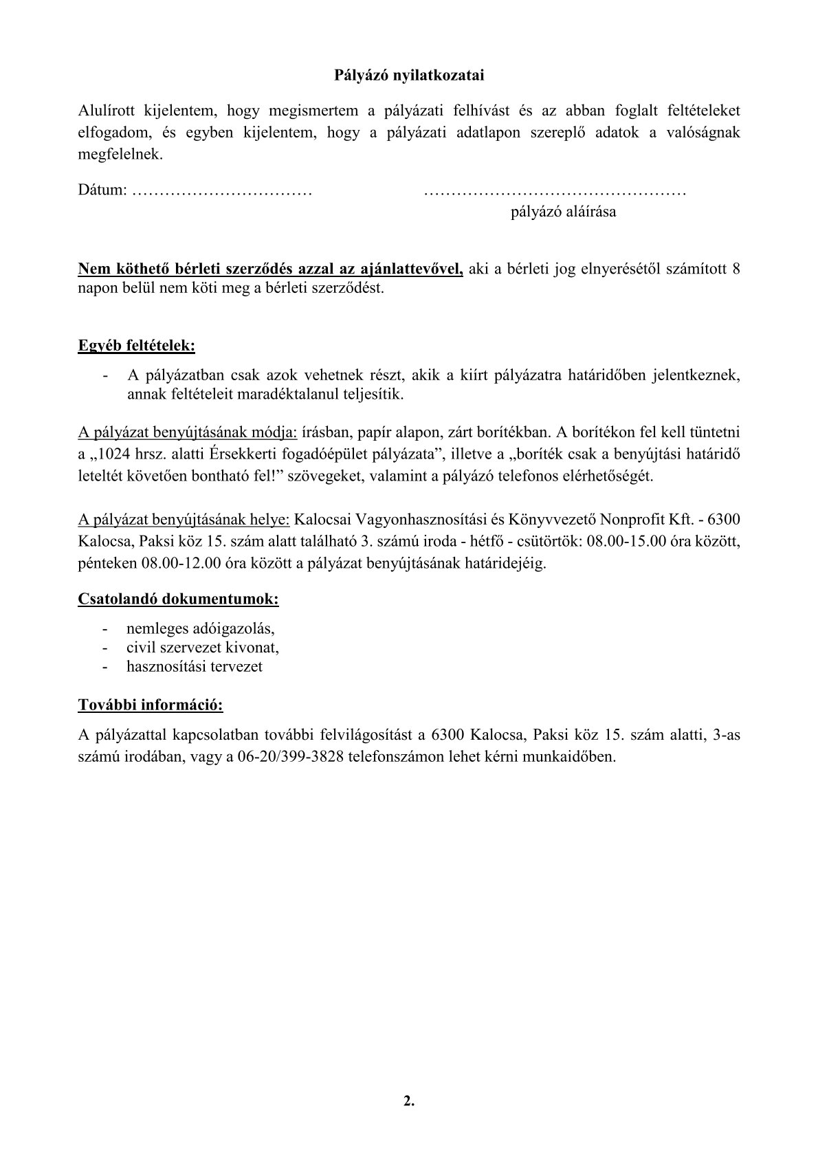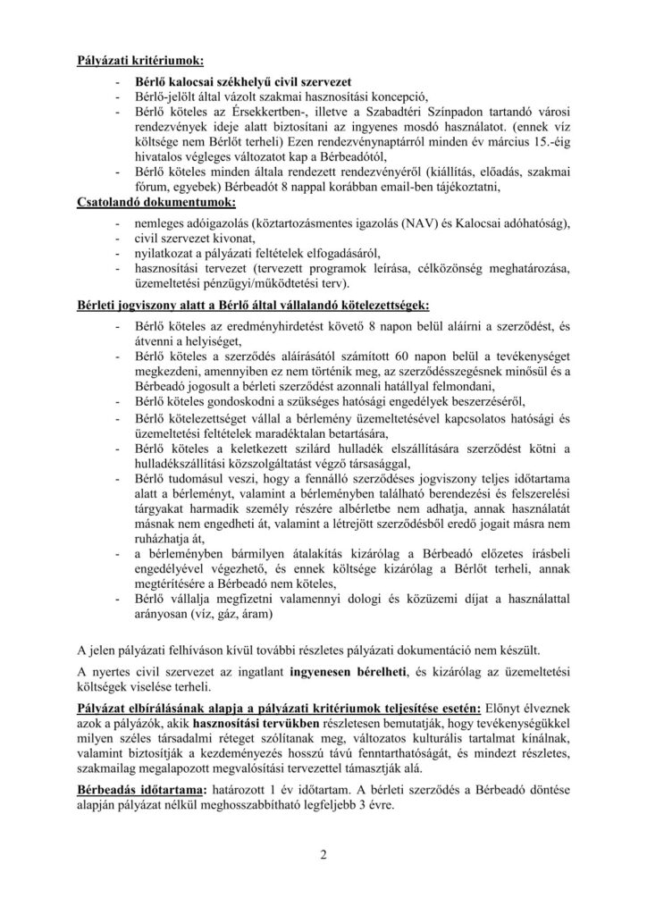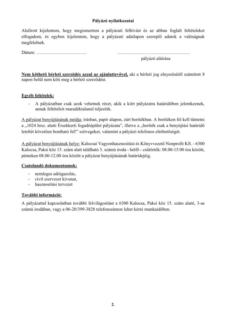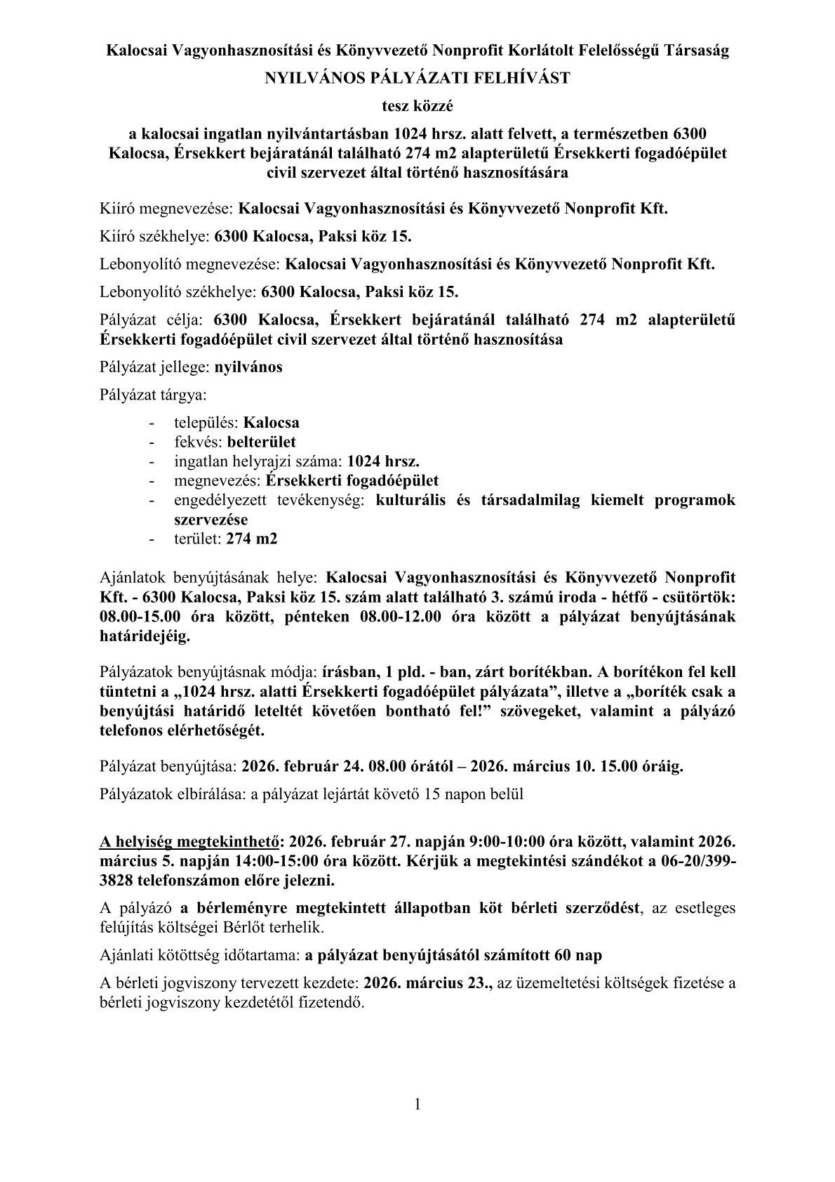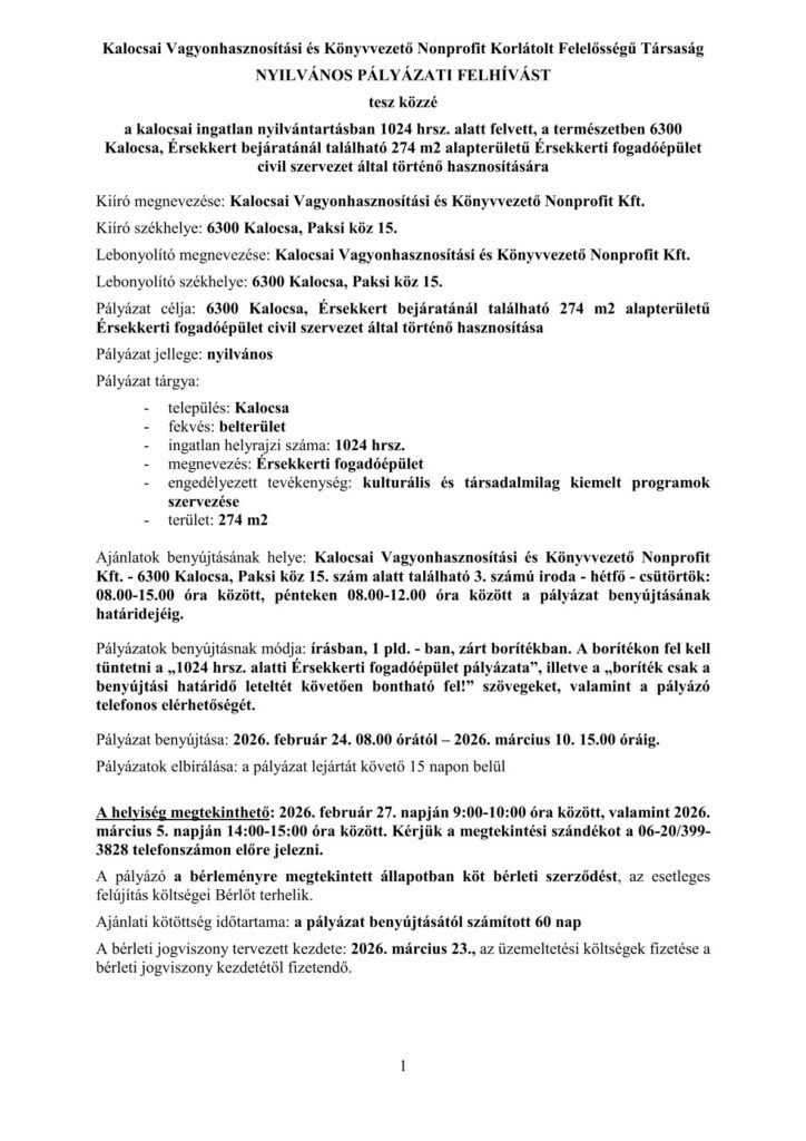 A Kalocsai Vagyonhasznosítási és Könyvezetői Nonprofit Kft nyilvános pályázati felhívást tesz közzé a kalocsai ingatlan nyilvántartásban 1024 hrsz. alatt felvett, a természetben 6300 Kalocsa, Érsekkert bejáratánál található 274 m2 alapterületű Érsekkerti fogadóépület civil szervezet által történő hasznosítására.