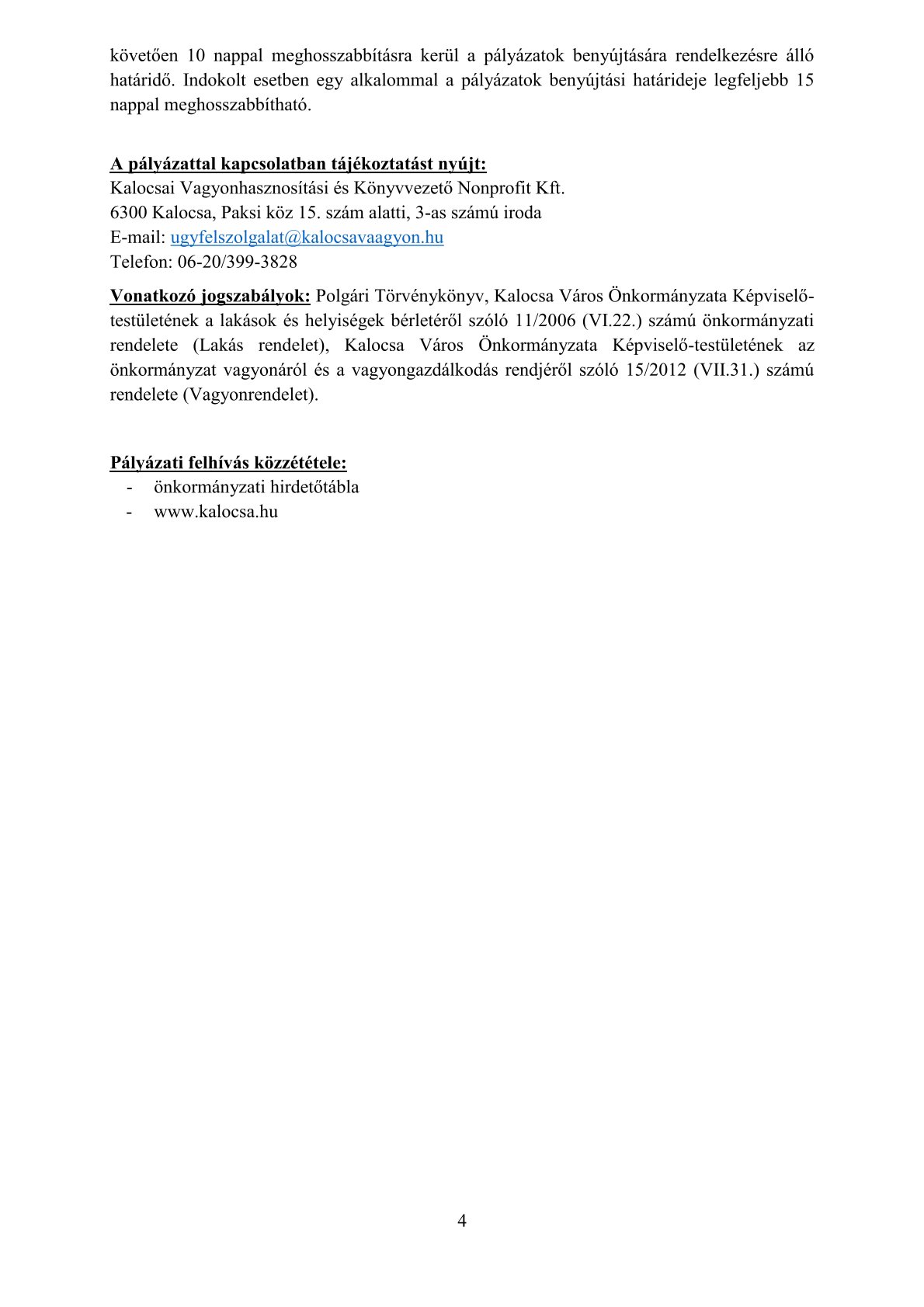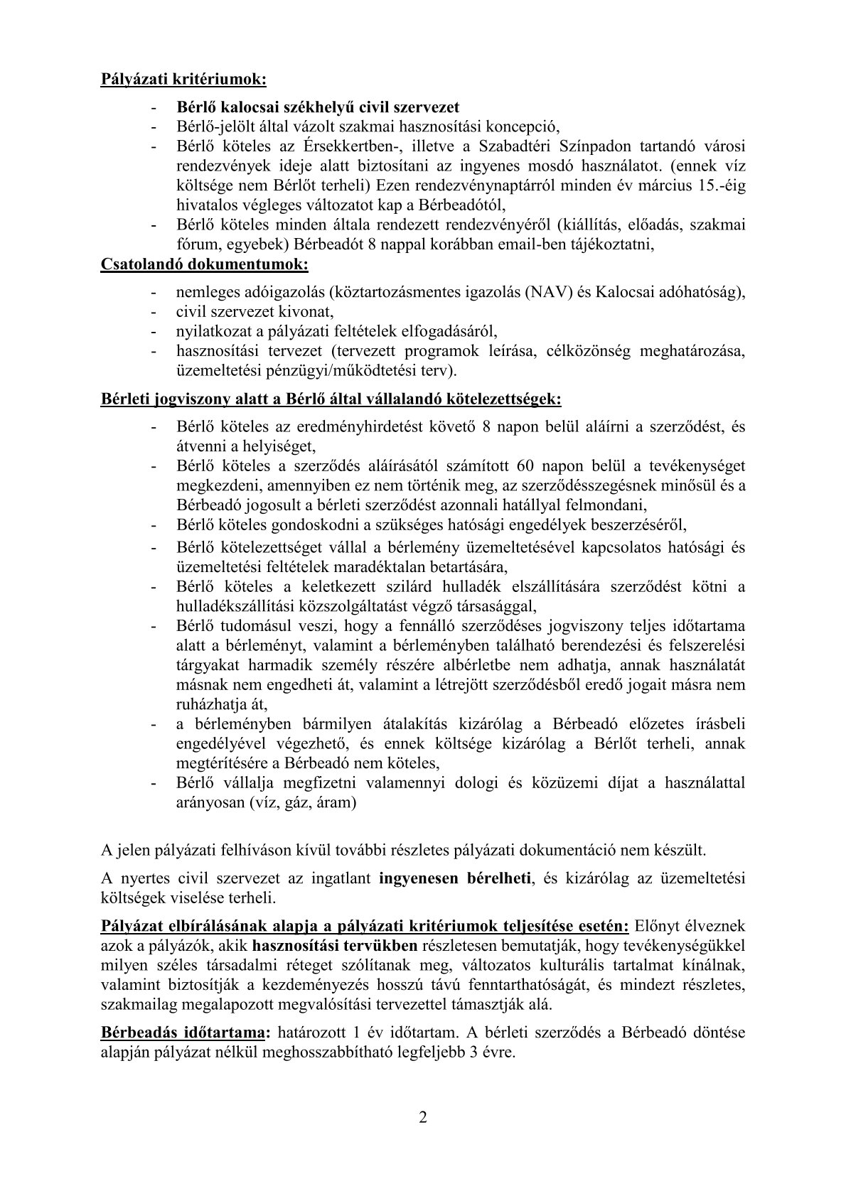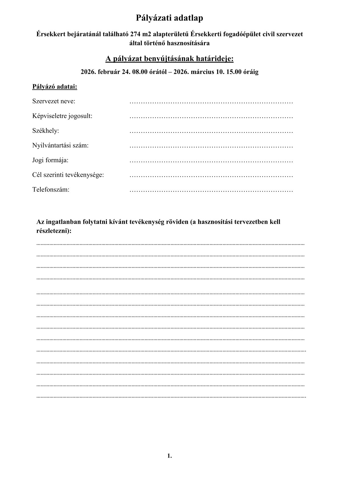 A Kalocsai Vagyonhasznosítási és Könyvezetői Nonprofit Kft nyilvános pályázati felhívást tesz közzé a kalocsai ingatlan nyilvántartásban 1024 hrsz. alatt felvett, a természetben 6300 Kalocsa, Érsekkert bejáratánál található 274 m2 alapterületű Érsekkerti fogadóépület civil szervezet által történő hasznosítására.