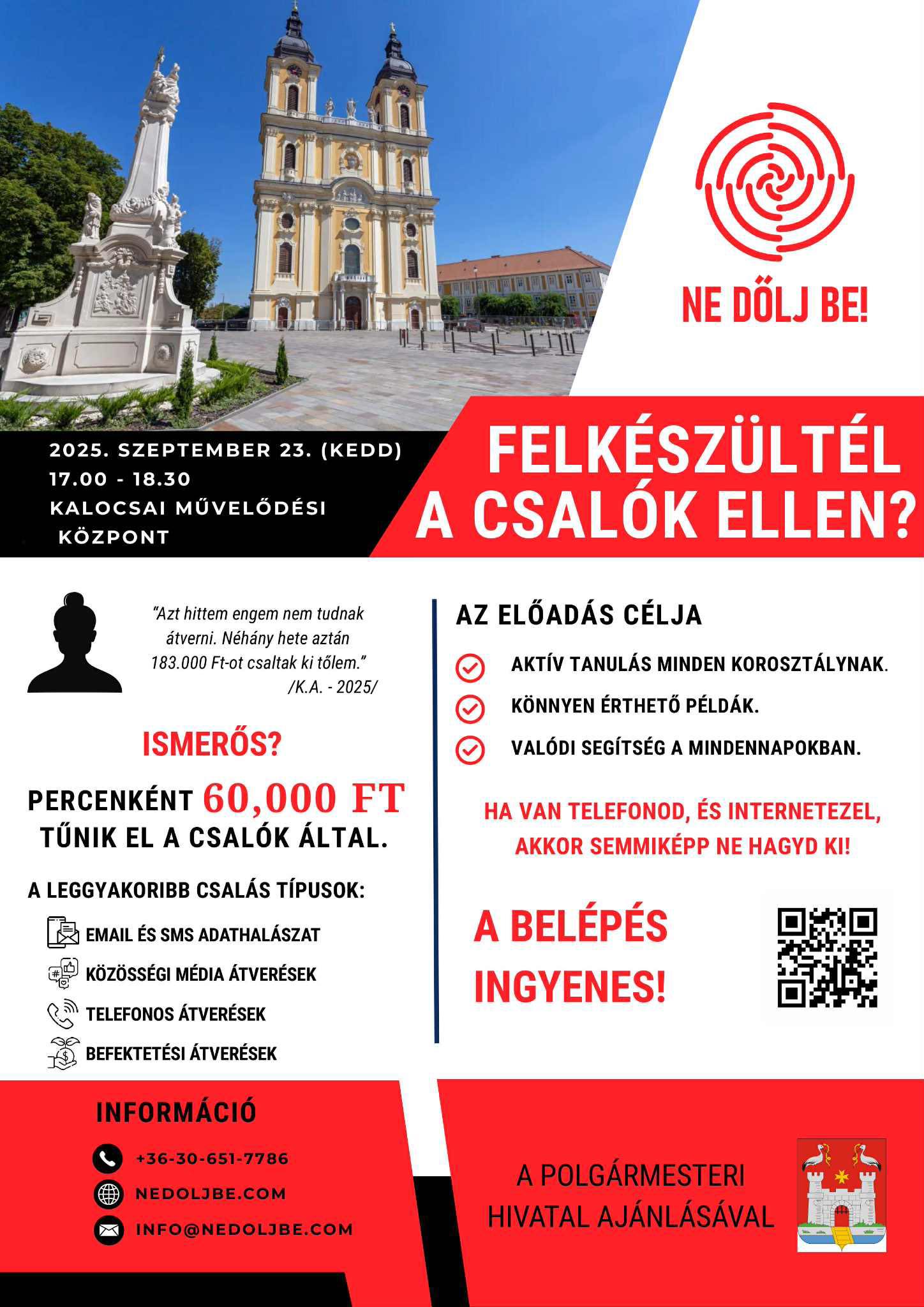Egyre több internetes, telefonos és SMS-es átverés célozza a lakosságot – sokszor éppen az idősebbeket. Ezek a csalások nemcsak anyagi, hanem komoly érzelmi károkat is okozhatnak. Most Kalocsán indul el a „Ne Dőlj Be!” országos társadalmi edukációs program, amely gyakorlati példákon keresztül mutatja be, hogyan ismerhetjük fel a csalókat, és milyen módszerekkel védekezhetünk ellenük.
