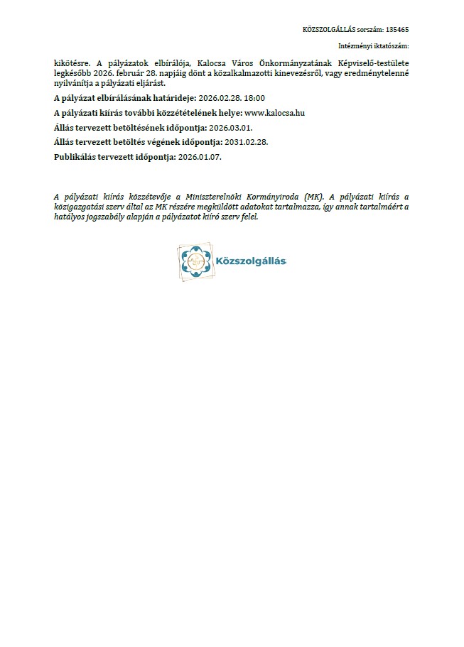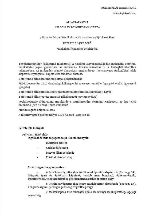 KALOCSA VÁROS ÖNKORMÁNYZATA pályázatot hirdet Közalkalmazotti jogviszony (Kjt.) keretében Intézményvezető munkakör/feladatkör betöltésére.