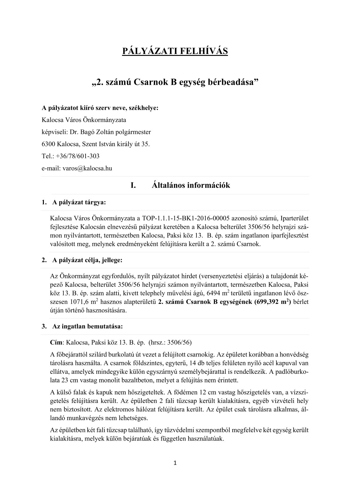 Pályázati felhívás Iparterület 2. sz. Csarnok B egység bérbe adására