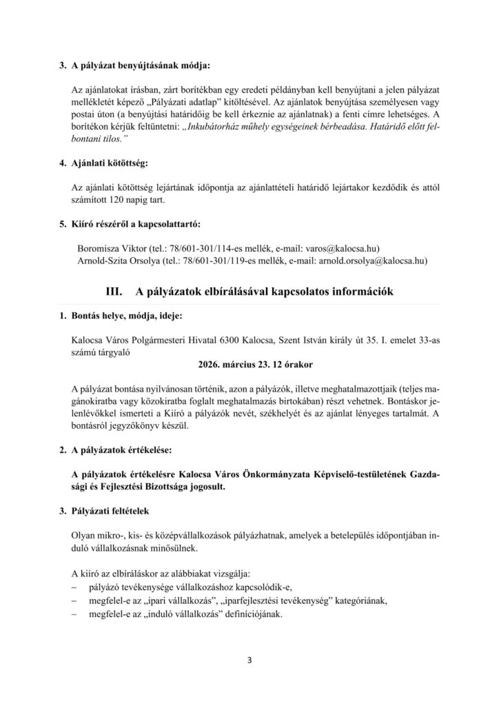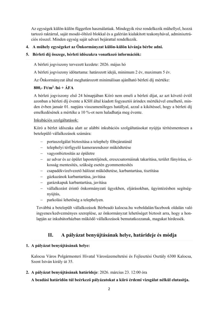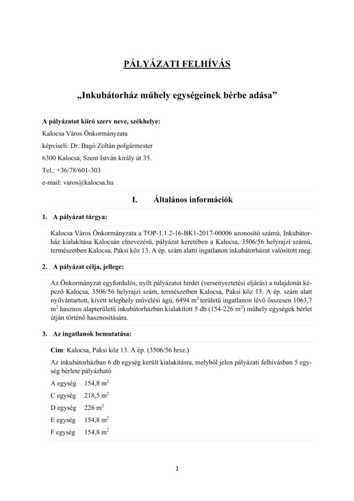 Kalocsa Város Önkormányzata a TOP 1.1.2-16.-BK1-2017-00006 azonosítási számú, Inkubátorház kialakítása Kalocsán elnevezésű projekt keretében a Kalocsa 3506/56 hrsz, természetben Kalocsa, Paksi köz 13. A épület szám alatti ingatlanon Inkubátorházat alakított ki. Kalocsa Város Önkormányzat Gazdasági és Fejlesztési Bizottsága a 18/2025. GFB határozata alapján az ingatlan hasznosításáról akként döntött, hogy azt nyílt pályázat útján kívánja bérbe adni.