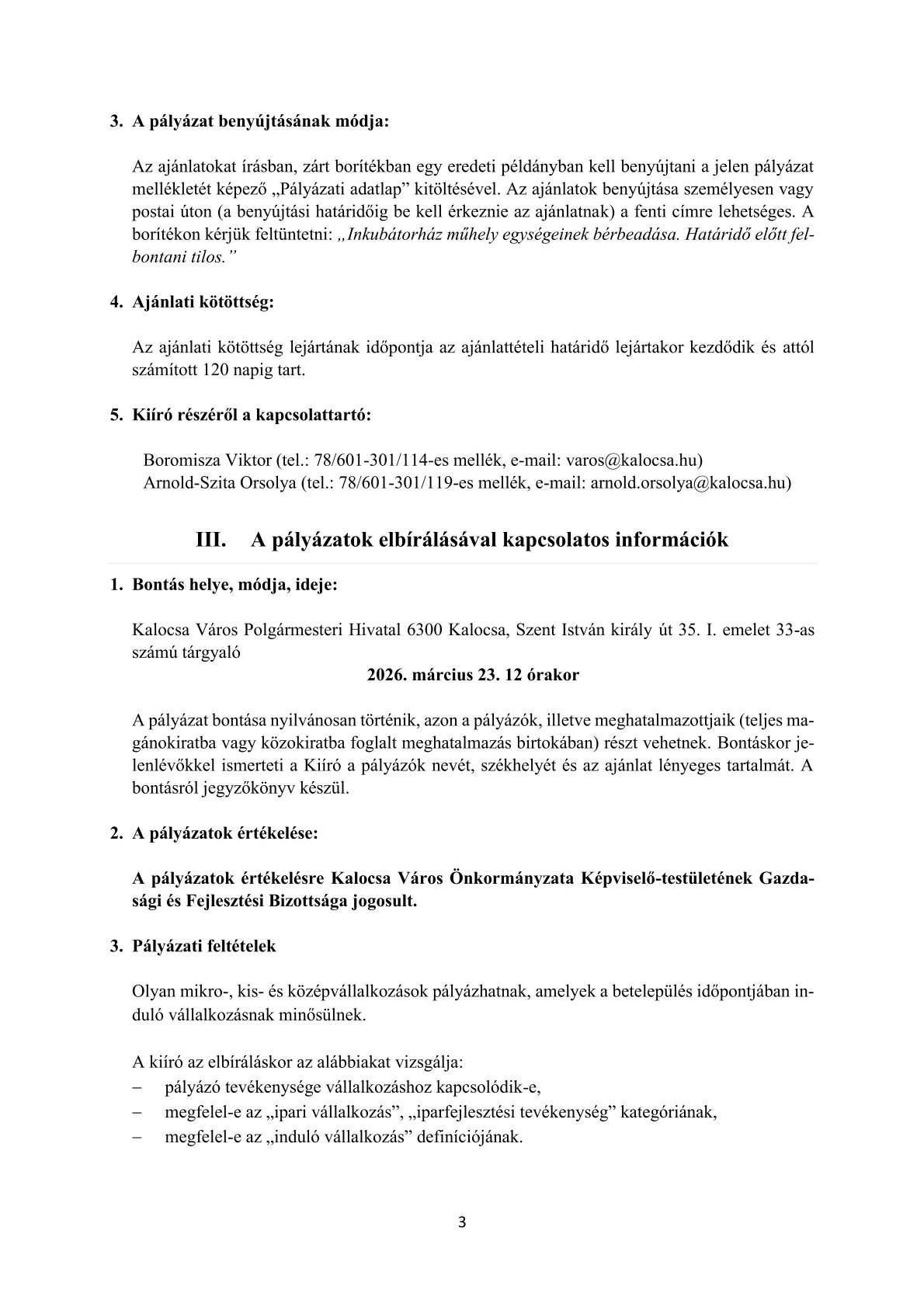 Kalocsa Város Önkormányzata a TOP 1.1.2-16.-BK1-2017-00006 azonosítási számú, Inkubátorház kialakítása Kalocsán elnevezésű projekt keretében a Kalocsa 3506/56 hrsz, természetben Kalocsa, Paksi köz 13. A épület szám alatti ingatlanon Inkubátorházat alakított ki. Kalocsa Város Önkormányzat Gazdasági és Fejlesztési Bizottsága a 18/2025. GFB határozata alapján az ingatlan hasznosításáról akként döntött, hogy azt nyílt pályázat útján kívánja bérbe adni.