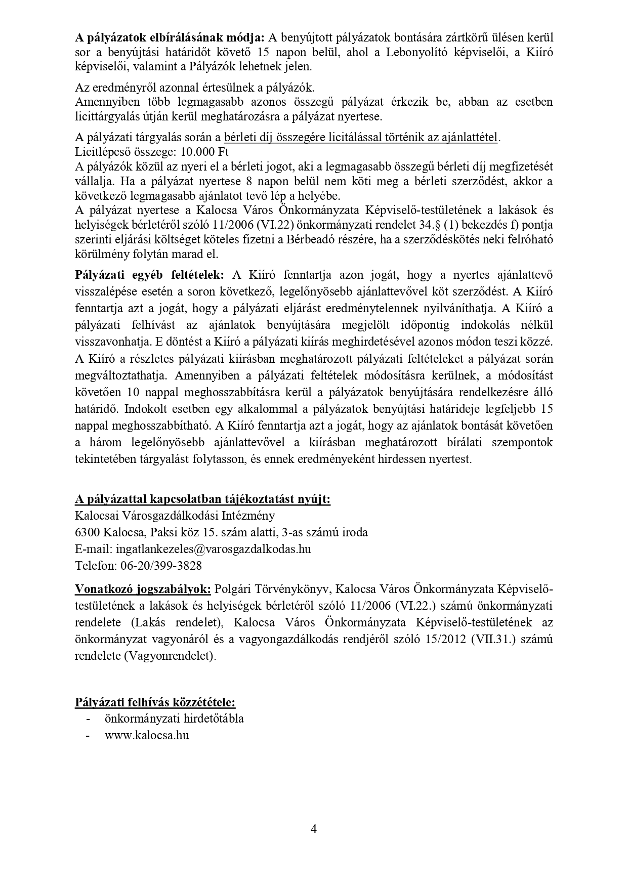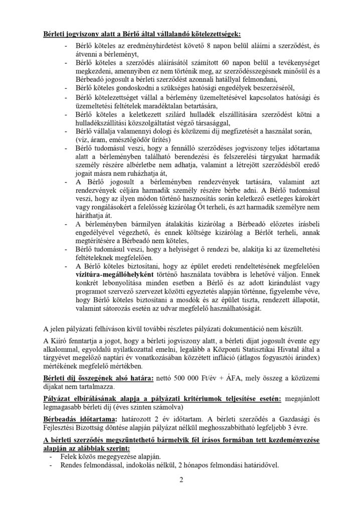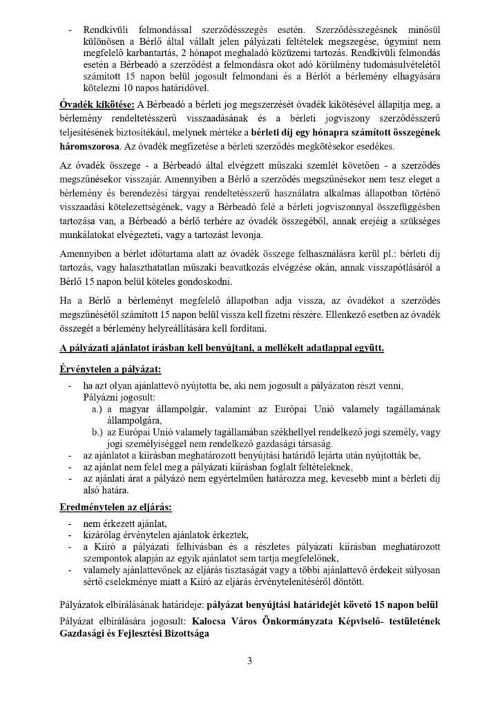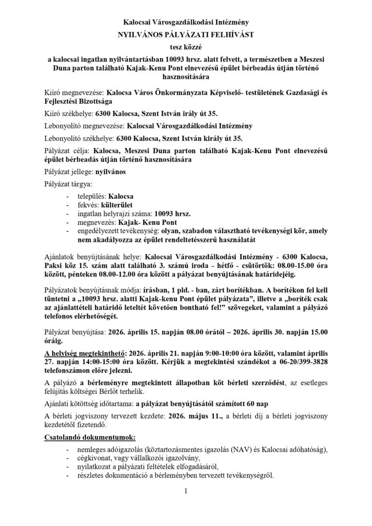 A Kalocsai Városgazdálkodási Intézmény nyilvános pályázatot ír ki a kalocsai ingatlan nyilvántartásban 10093 hrsz. alatt felvett, természetben a Meszesi Duna parton található Kajak-kenu Pont elnevezésű épület bérbeadás útján történő hasznosítására.