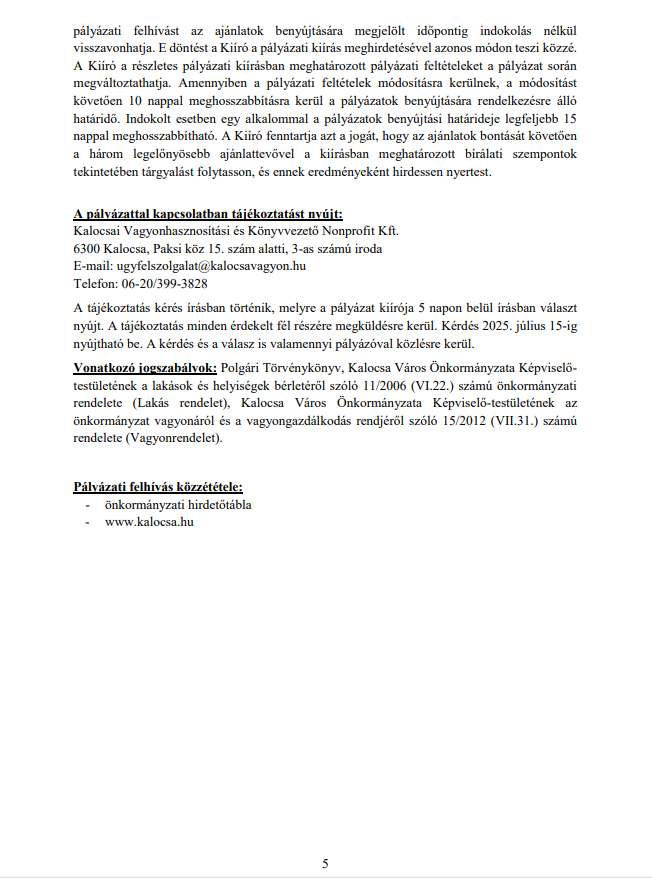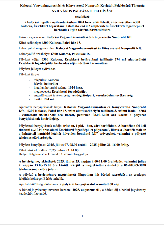 PÁLYÁZATI KIÍRÁS 2025. június 18. A KalocsaVagyon Kft. a következő pályázati kiírást teszi közzé. Pályázati kiírás Fogadóépület Pályázati adatlap Fogadóépület