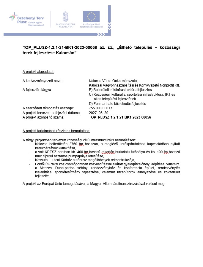 TOP Plusz-1.2.1-21-BK1-2023-00056 – Élhető település – közösségi terek fejlesztése Kalocsán