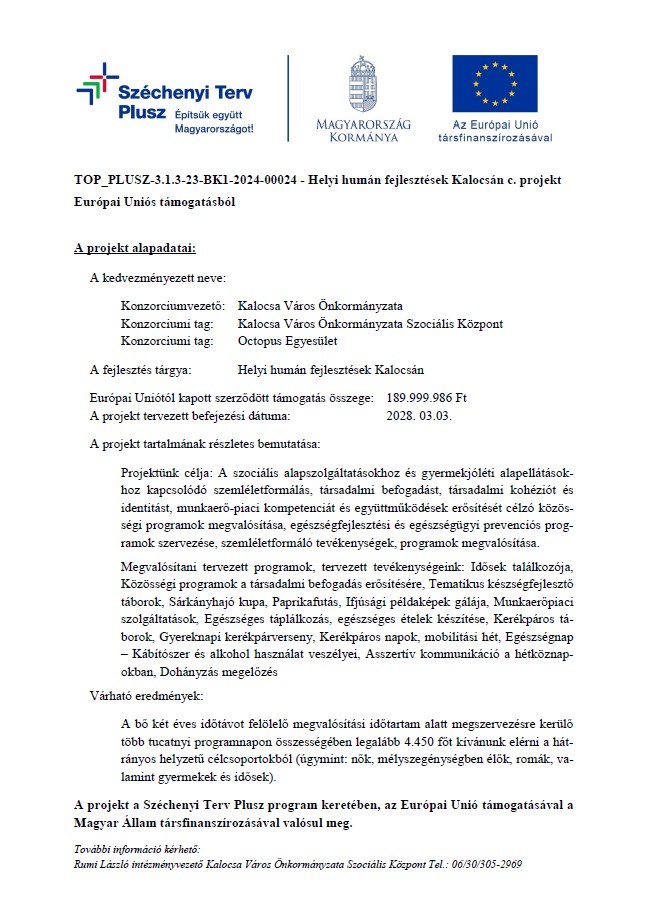 TOP_PLUSZ-3.1.3-23-BK1-2024-00024 – Helyi humán fejlesztések Kalocsán A pályázat kiírása olvasható a fotón.