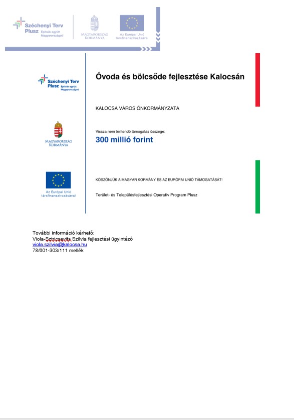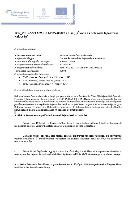 TOP_PLUSZ-3.3.1-21-BK1-2022-00023 az. sz., „Óvoda és bölcsőde fejlesztése Kalocsán”
